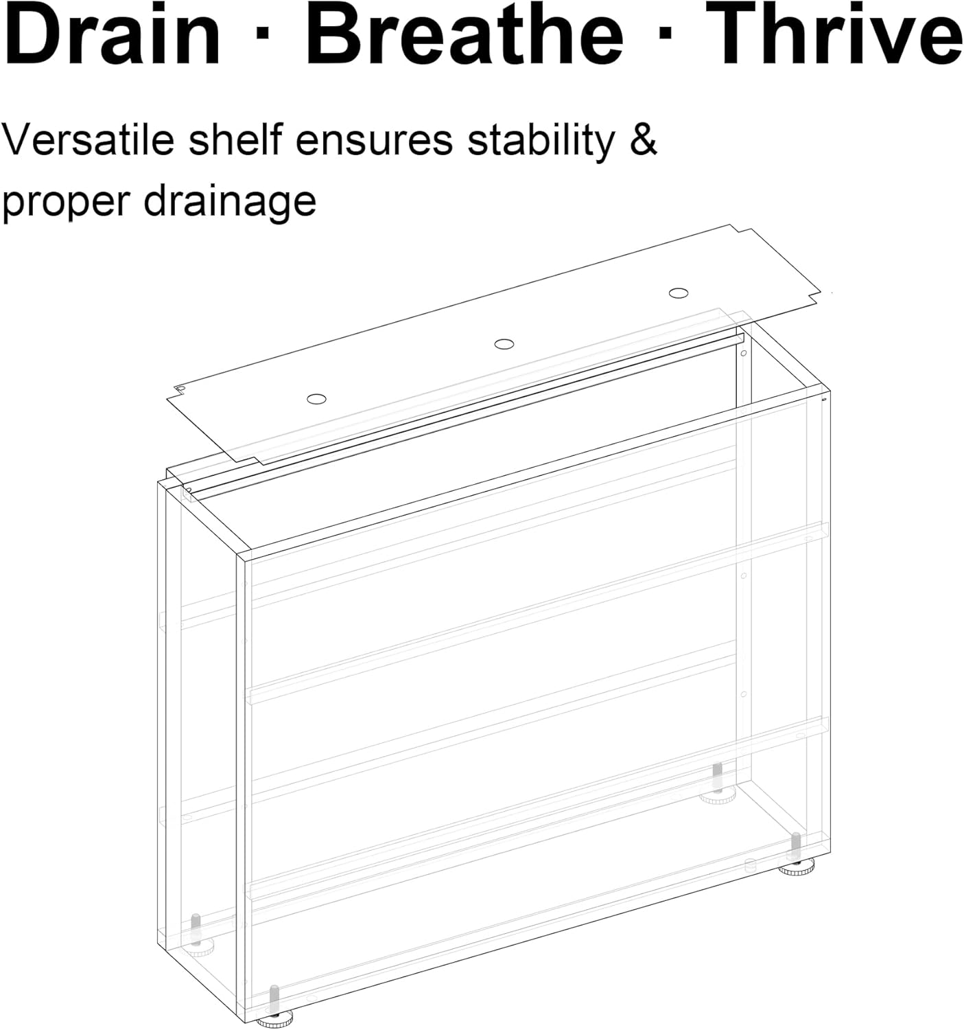 • Adjustable Shelf with Drainage Holes & Height-Adjustable Legs Shelf height adapts to different plant sizes, with 3 drain holes for water control. Adjustable feet provide balance on uneven ground while improving airflow and surface protection.