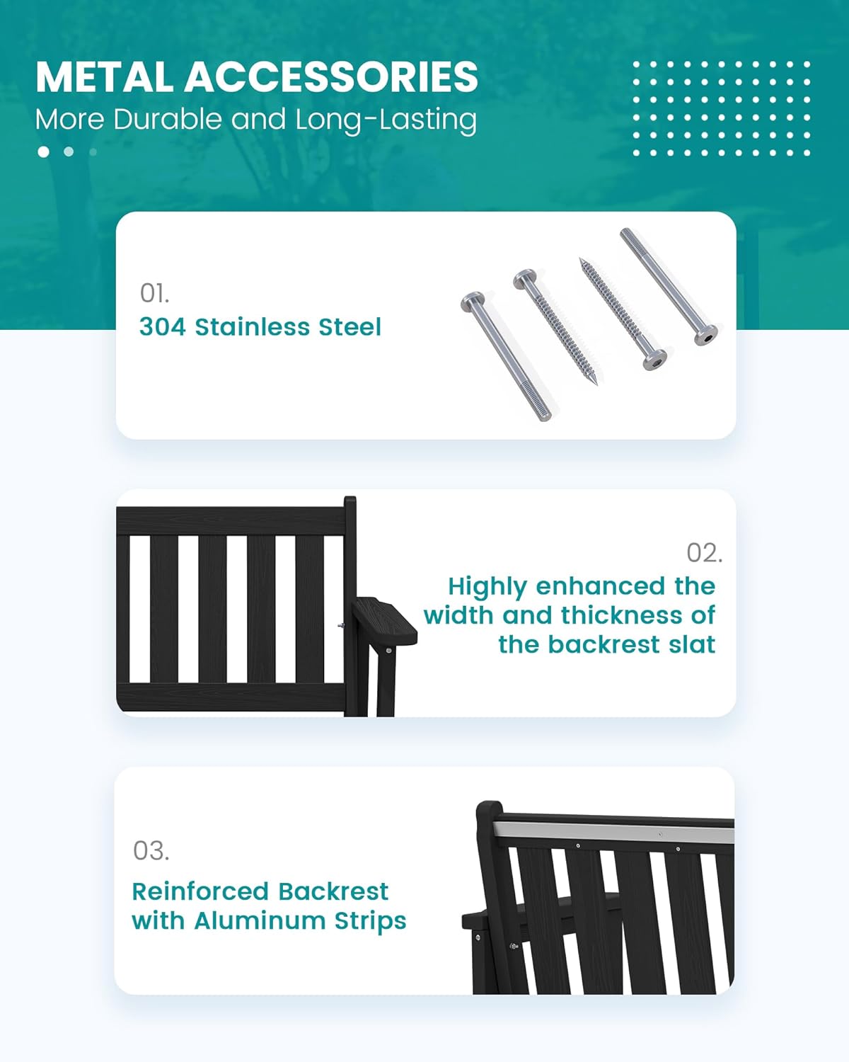 • Reinforced Aluminum Bar: SERWALL garden benches for outdoors are built to last, with sturdy aluminum strips reinforcing the backrest for added durability without compromising comfort. The reinforced chair is more durable and resistant to deformation, ensuring long-term outdoor use.
