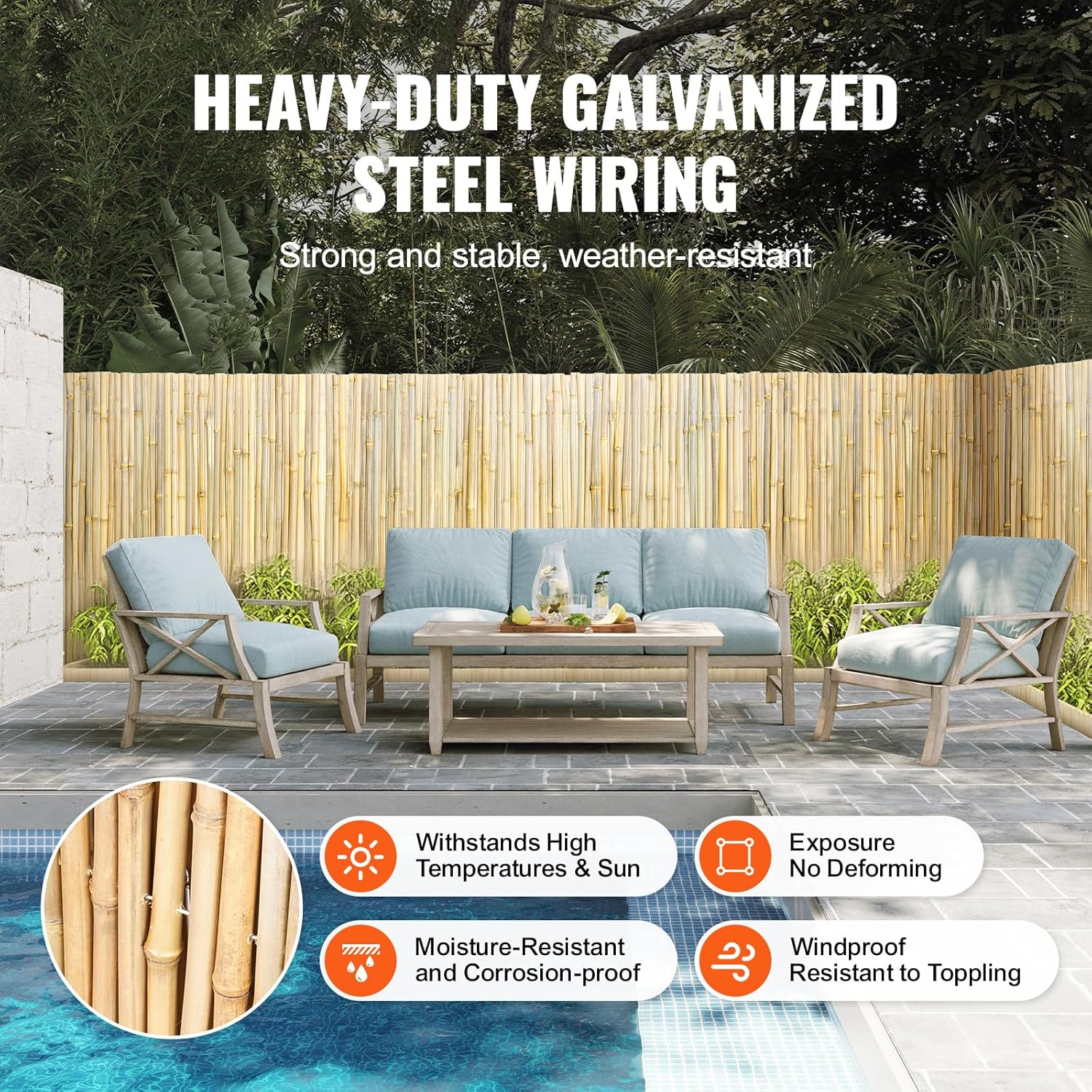 • Sturdy and Durable: Each bamboo panel piece is secured with heavy-duty galvanized steel wire, ensuring rust resistance and overall strength. The bamboo undergoes heat treatment to enhance its waterproof feature, extending its lifespan. Embrace green living!