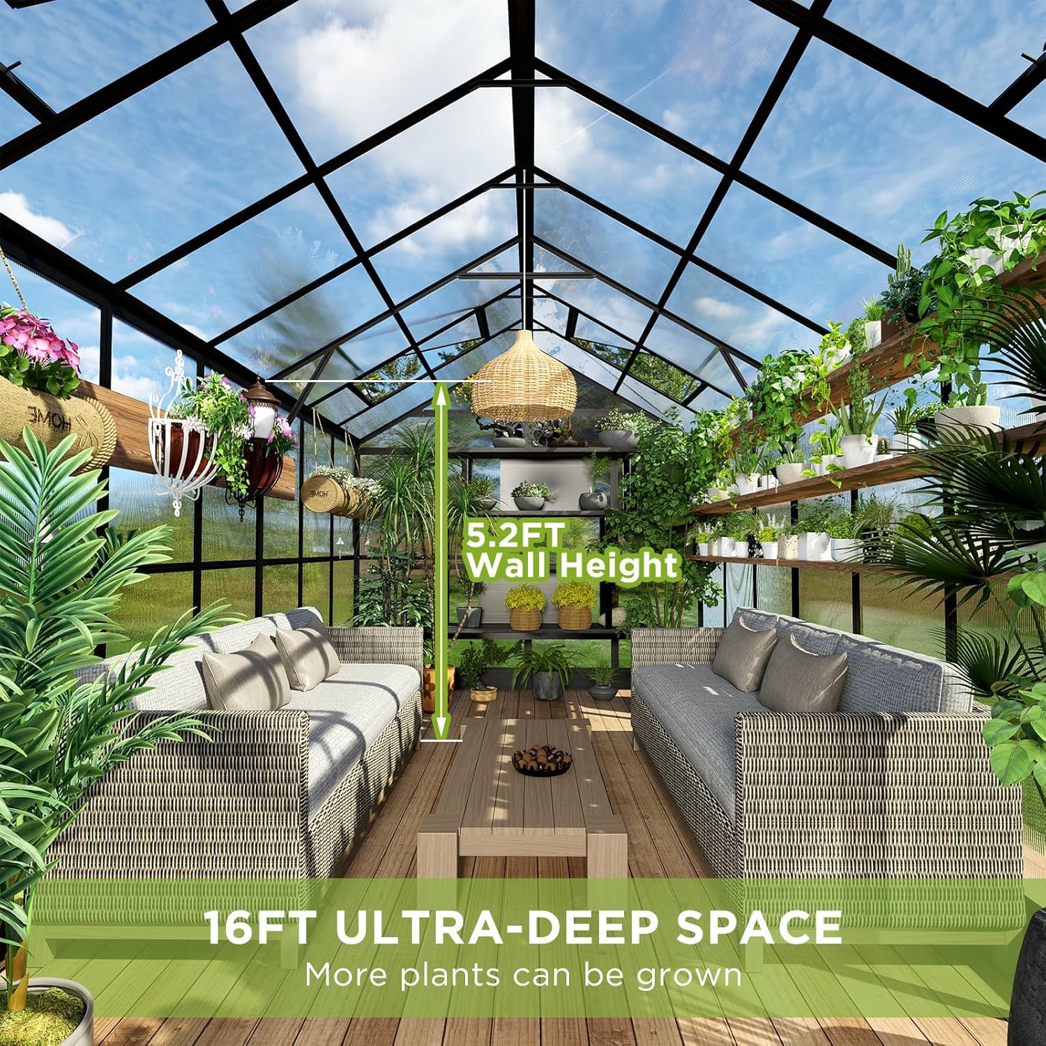 HOWE 8x16x7.5 FT Polycarbonate Greenhouse with Swing Doors, 4 Vents, 5.2FT Added Wall Height, Walk-in Large Aluminum Greenhouse for Outdoors, Black