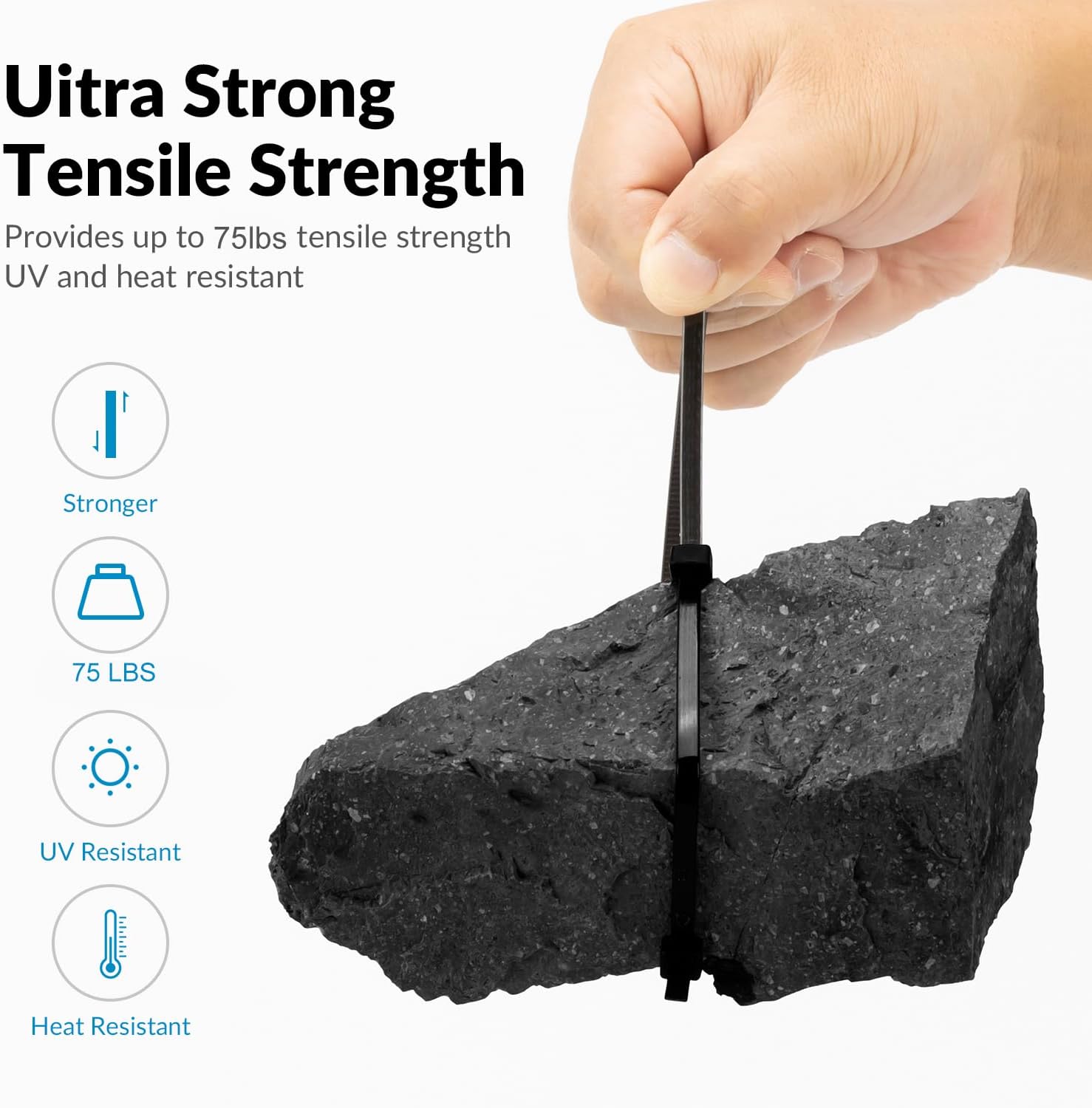 • 【Details】Dimensions: Length: 14" | Width : 0.14" | Max Dia: 4" |Tensile Strength: 75lbs |With 1200 PCS zip ties, you don't have to worry about running out of in the middle of your project.