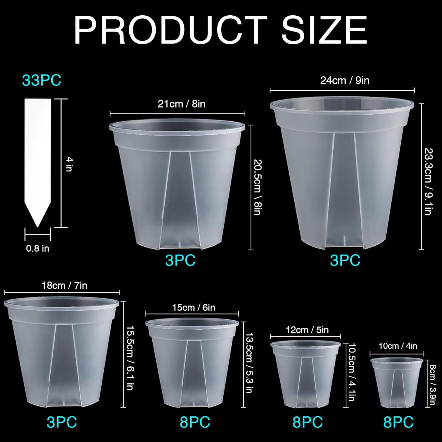33PCS Frosted Clear Plastic Plant Pots with 33 Plant Labels 4/5/6/7/8/9 Inch Thickened PP Nursery Pots for Indoor Outdoor Plants
