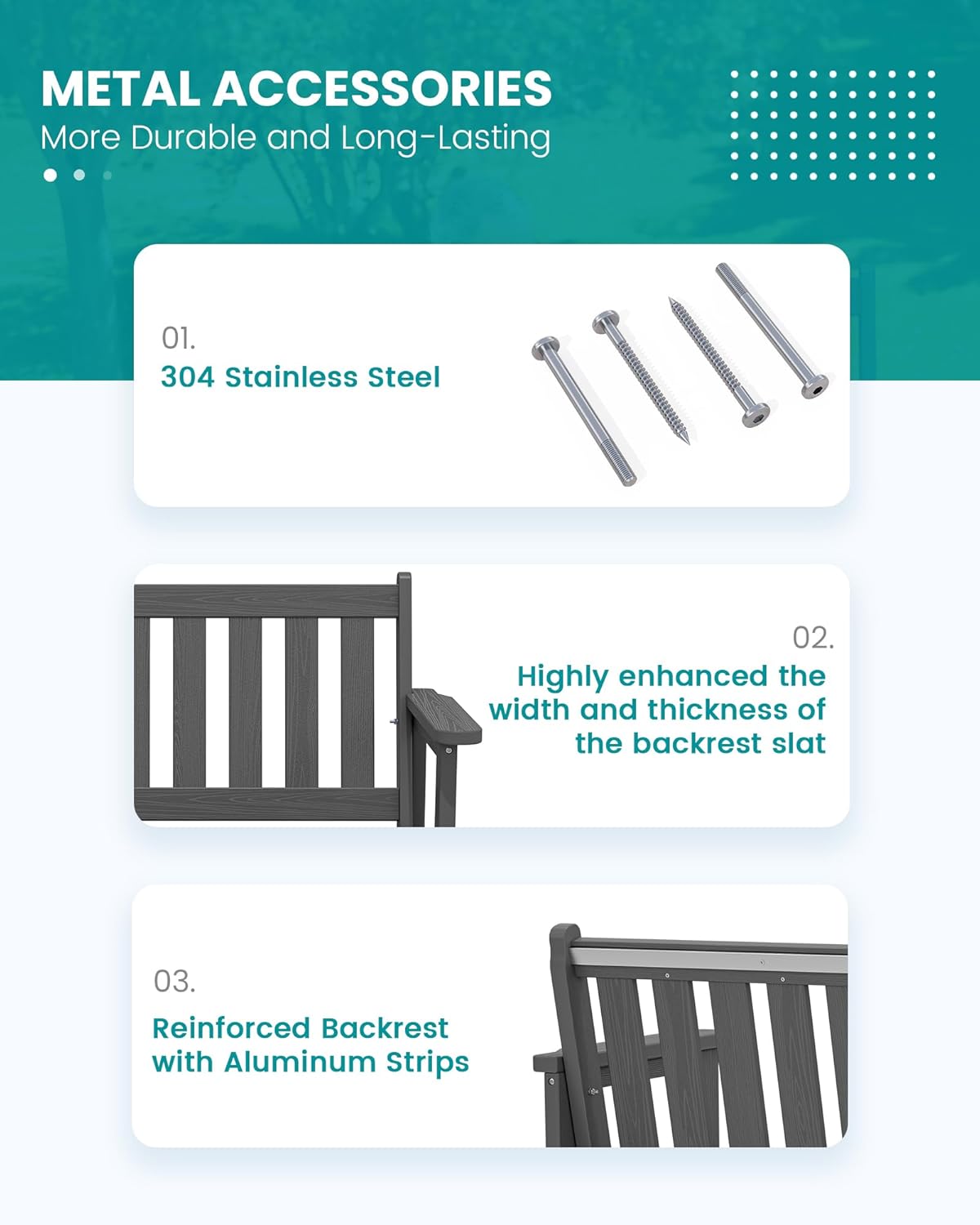 • High Weight Capacity: Tested to support up to 660 lbs, this outdoor bench is suitable for people of various body types and sizes. Its sturdy structure and premium materials ensure lasting performance.