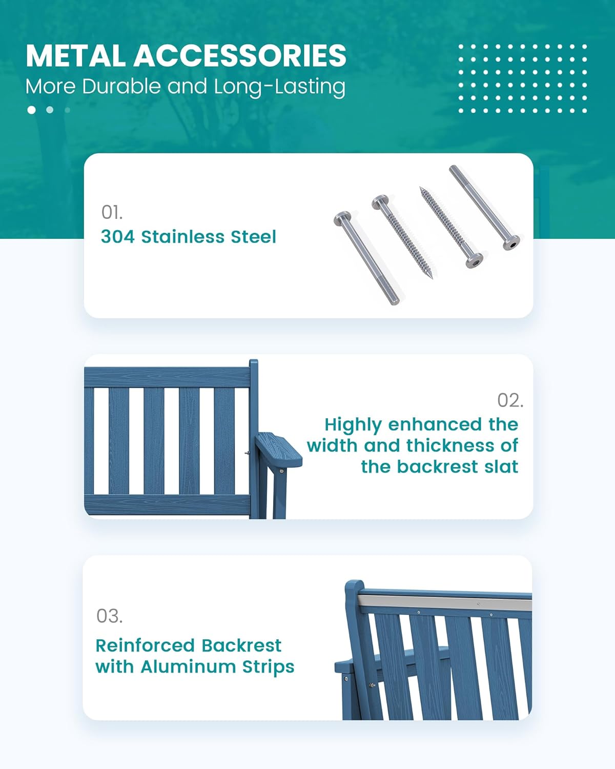 • Reinforced Aluminum Bar: SERWALL garden benches for outdoors are built to last, with sturdy aluminum strips reinforcing the backrest for added durability without compromising comfort. The reinforced chair is more durable and resistant to deformation, ensuring long-term outdoor use.