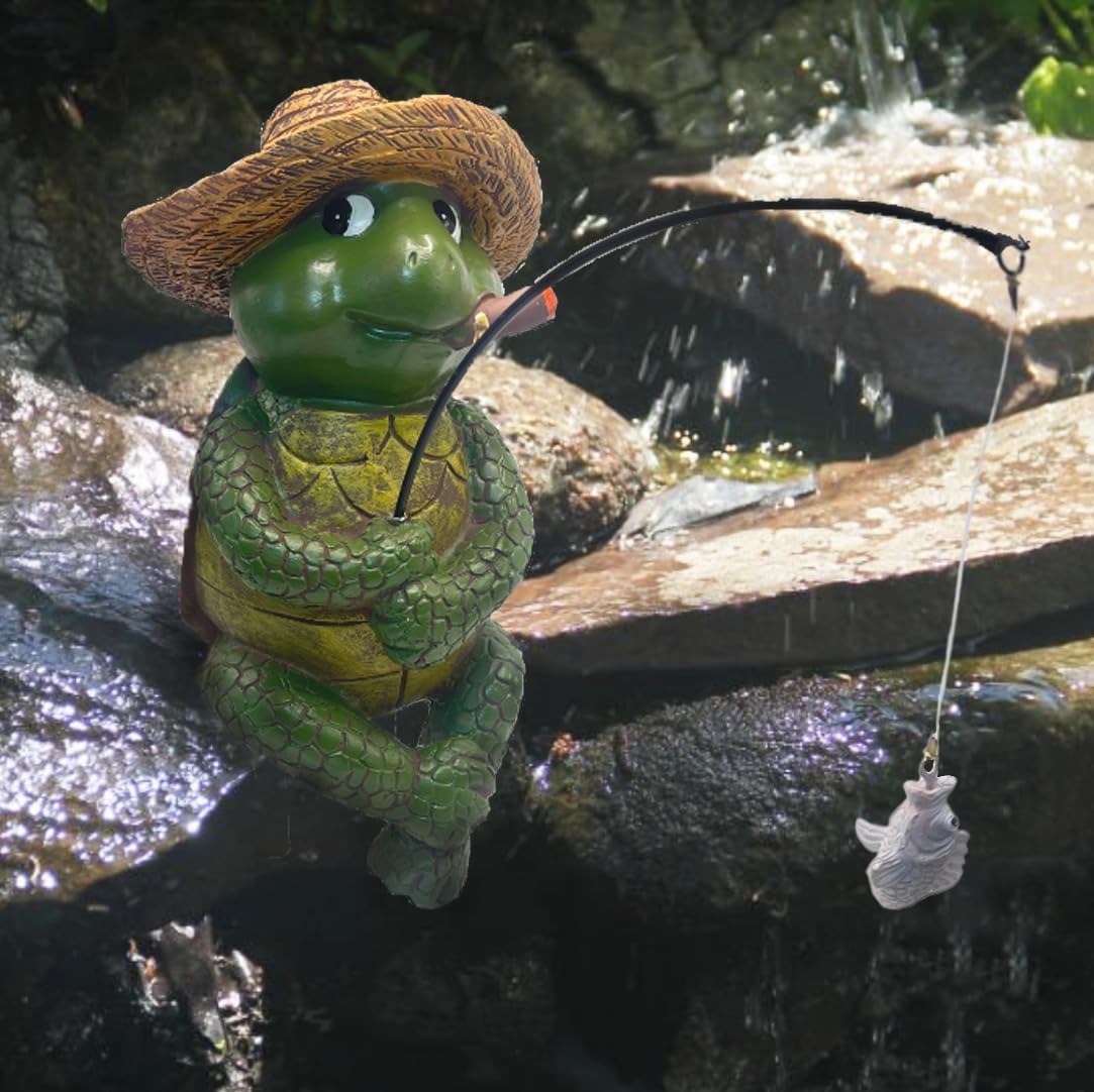 • Whimsical Fishing Garden Decor: Enhance your garden decor with this charming tortoise fishing sculpture, perfect for fish ponds, koi fish decor, or as part of a pond waterfall. Its playful design adds a rustic, peaceful ambiance to any outdoor or indoor space.