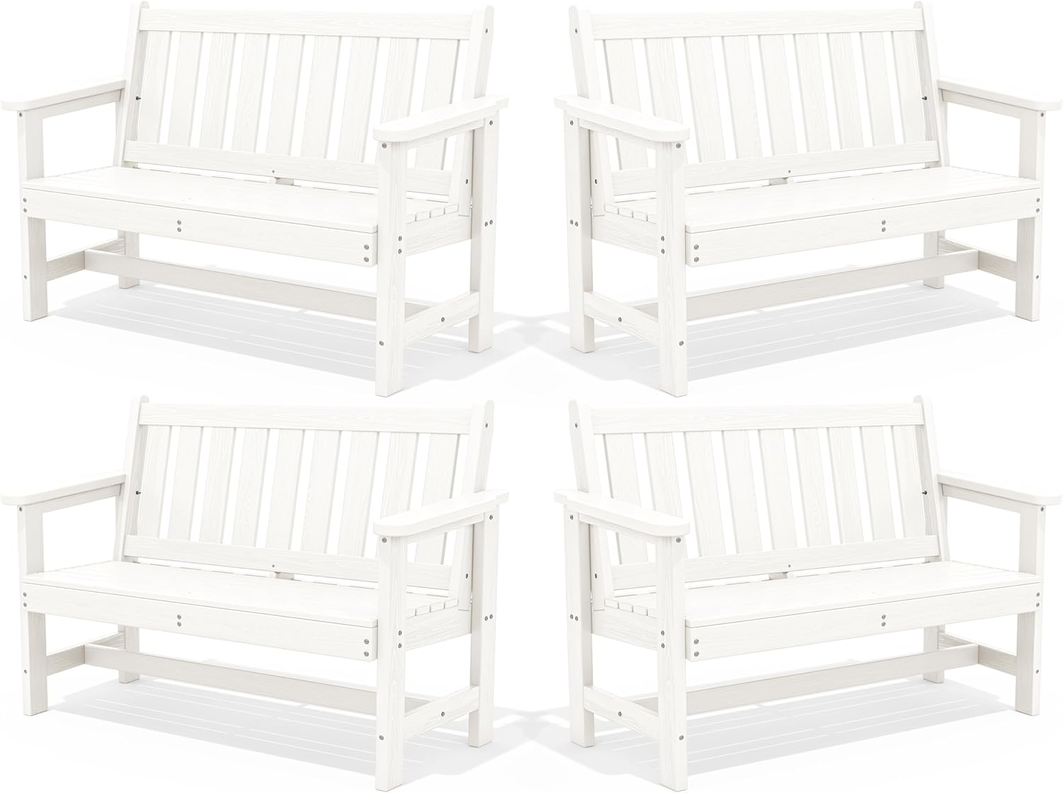 SERWALL Outdoor Bench, HDPE Outdoor Benches Weatherproof, 2-Person Garden Bench with 660 lbs Weight Capacity, Patio Benches for Outdoors, Garden, Porch, Backyard and Park, White, 4 Pack