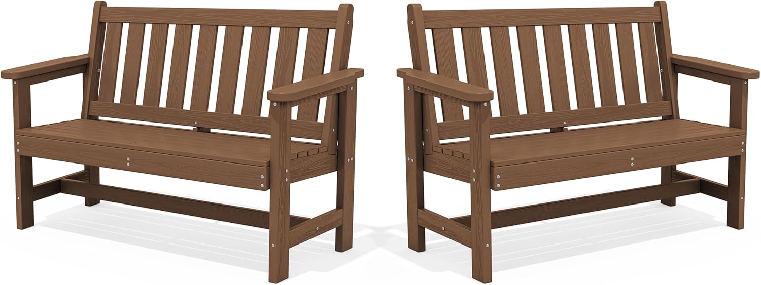 SERWALL Outdoor Bench, HDPE Outdoor Benches Weatherproof, 2-Person Garden Bench with 660 lbs Weight Capacity, Patio Benches for Outdoors, Garden, Porch, Backyard and Park, Brown, 2 Pack