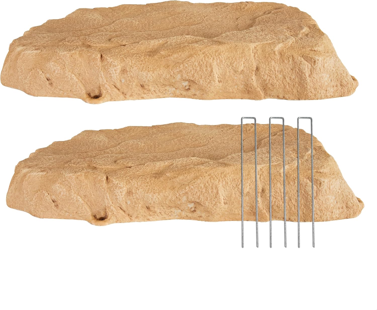 • HIDES UNSIGHTLY YARD OBJECTS: Cover small utility covers, manholes, and other short objects in the yard with these flat fake landscape rocks. Each artificial boulder measures 30.75" W x 20" D x 3.5" H and weighs 4.2 lbs. The stakes included with each rock measure 1" W x 12" H each.