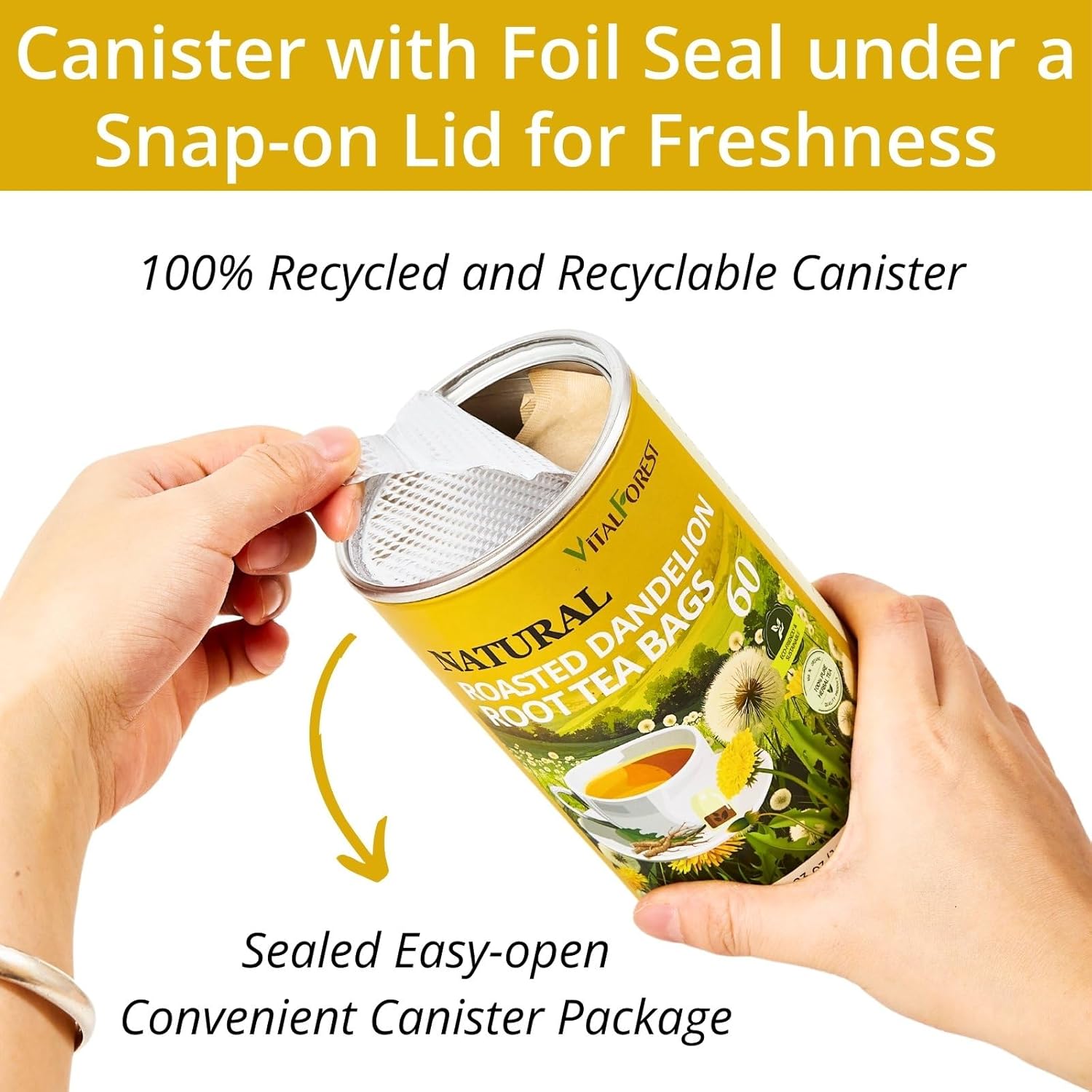60 Roasted Dandelion Root Tea Bags, 2g/Bags, VitalForest Natural Detox Dandelion Tea, Dried Dandelion Root Coffee Substitute, Diente De Leon, Caffeine Free, Canister Packaged