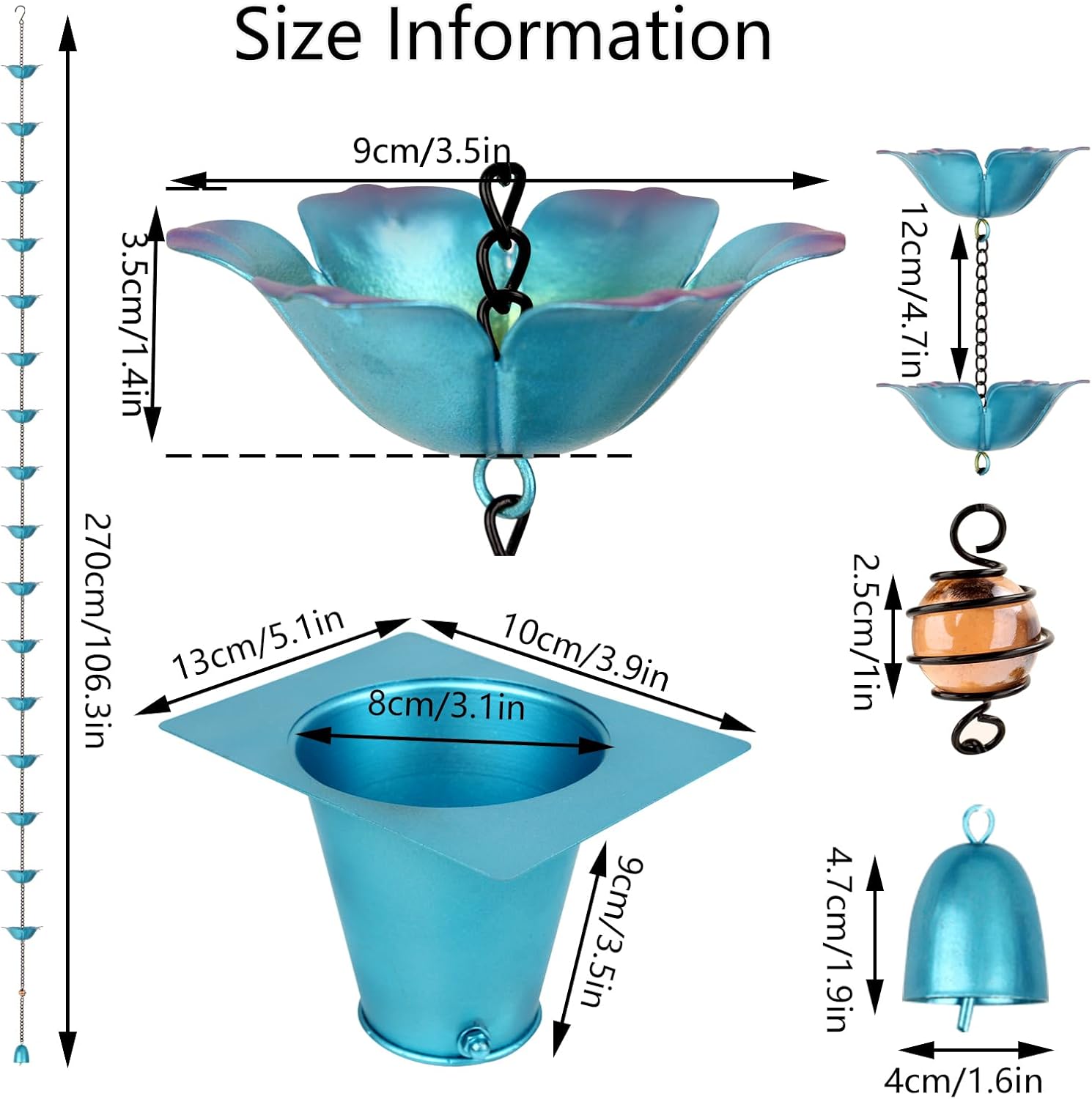 • MULTIFUNCTIONAL: Our rainwater chain can not only effectively replace traditional downpipes to help direct rainwater to a designated area, which contributes to the rational use of water resources, but can also be used as a decorative piece to enhance the beauty of your balcony or outside environment. Whether it is hung on the patio, balcony or porch, it can be a bright landscape.