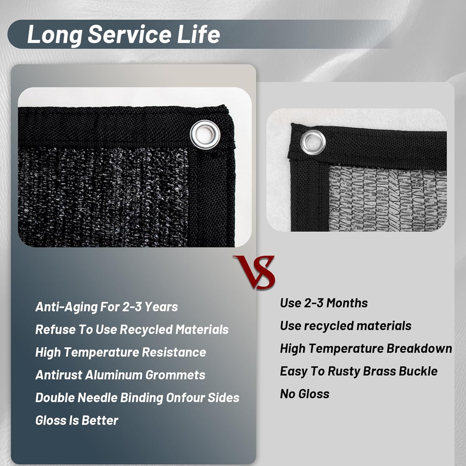 • 【90% Shading Rate】Made of 100% New High Density Polyethylene (HDPE) fabric material, has a shading rate up to 90% can avoiding direct sunlight while allowing free air circulation.