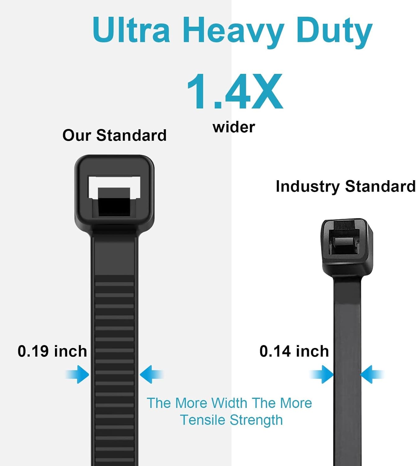 • 【100lb Tensile Strength】: The more width and Thickness, the more tensile strength. our zip ties 14 inch width is 0.19 inch(4.8mm), while industry standard is 0.14 inch(3.6mm), our zip ties 14 inch Thickness is 0.065" inch(1.65 mm), while industry standard is 0.05 inch(1.25mm),more tensile strength.
