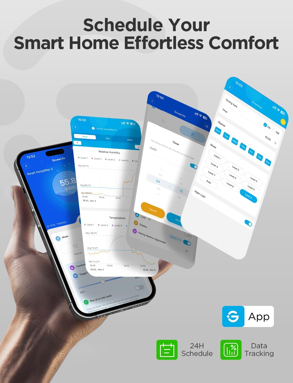 • Auto Mode for Precise Humidification: Built-in high-precision sensor combined with auto mode allows you to set and maintain the bedroom in the ideal humidity range, keeping you comfortable all winter. Connect GoveeLife Thermo-Hygrometer to maintain more precise humidity control and more convenient humidity calibration. (Thermo-Hygrometer not included.)