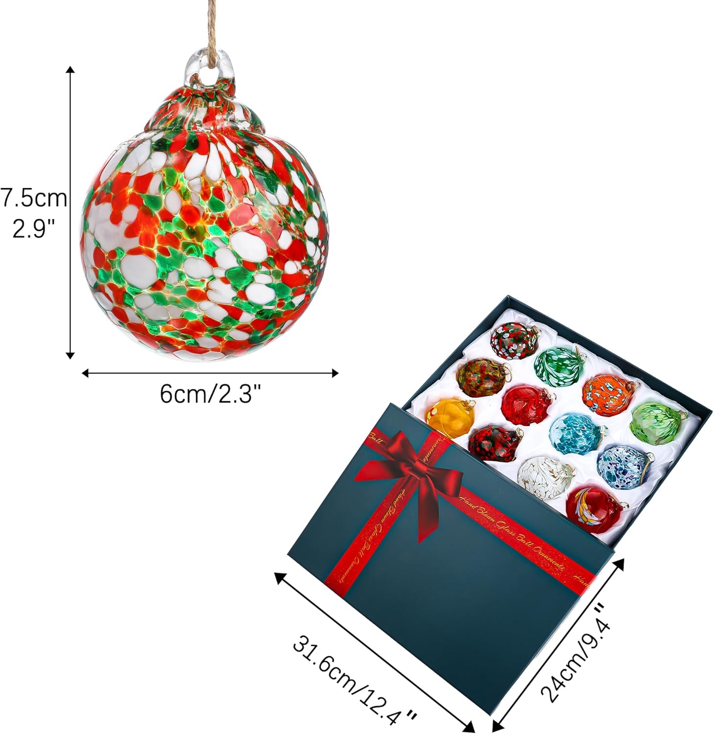• Specifications:The size of each hanging Gazing ball is 2.3*2.3*2.9 inches.The total weight of 12 Christmas ornaments balls is 1320g.