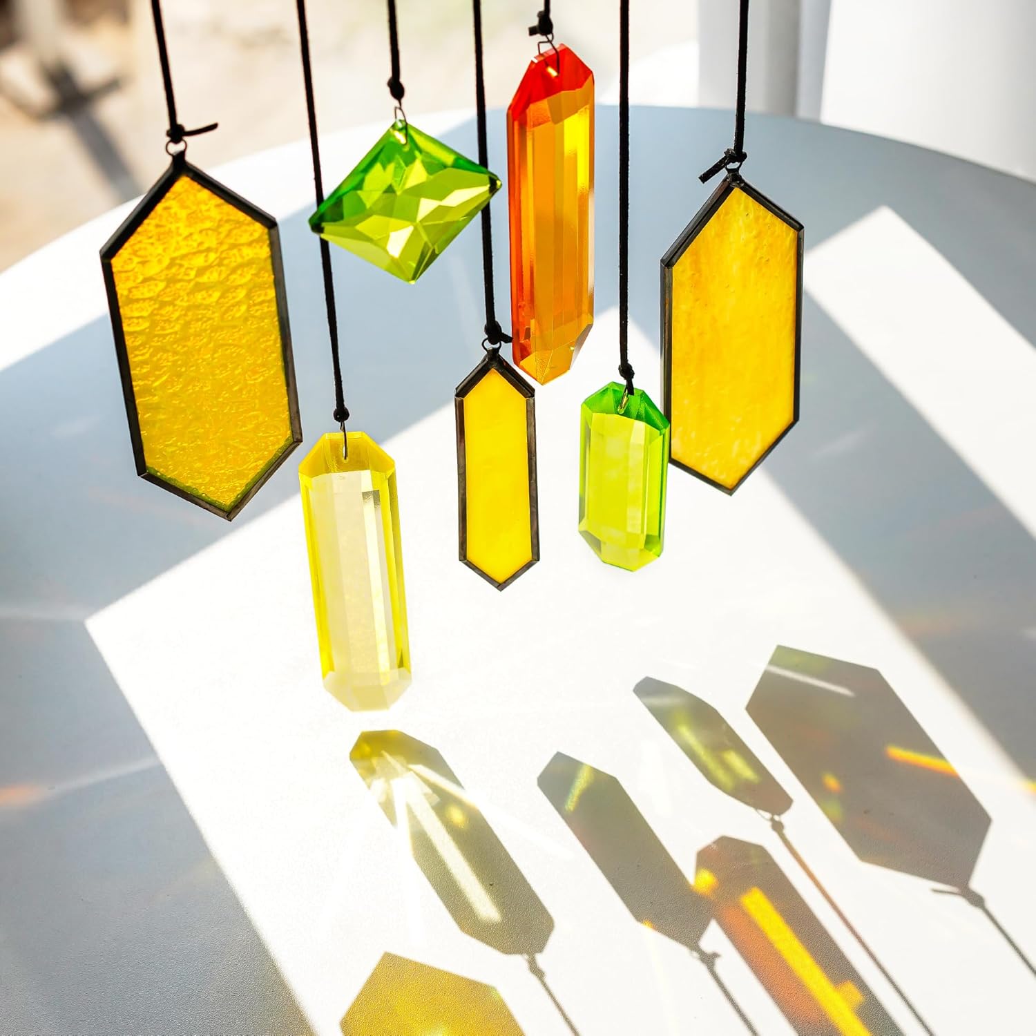 • Features: Including 4pcs crystal prisms and 3pcs stained glass panels, combining with yellow, orange and green color, just like Fairy Tale Forest, creating a dazzling sparkle when exposed to sunlight