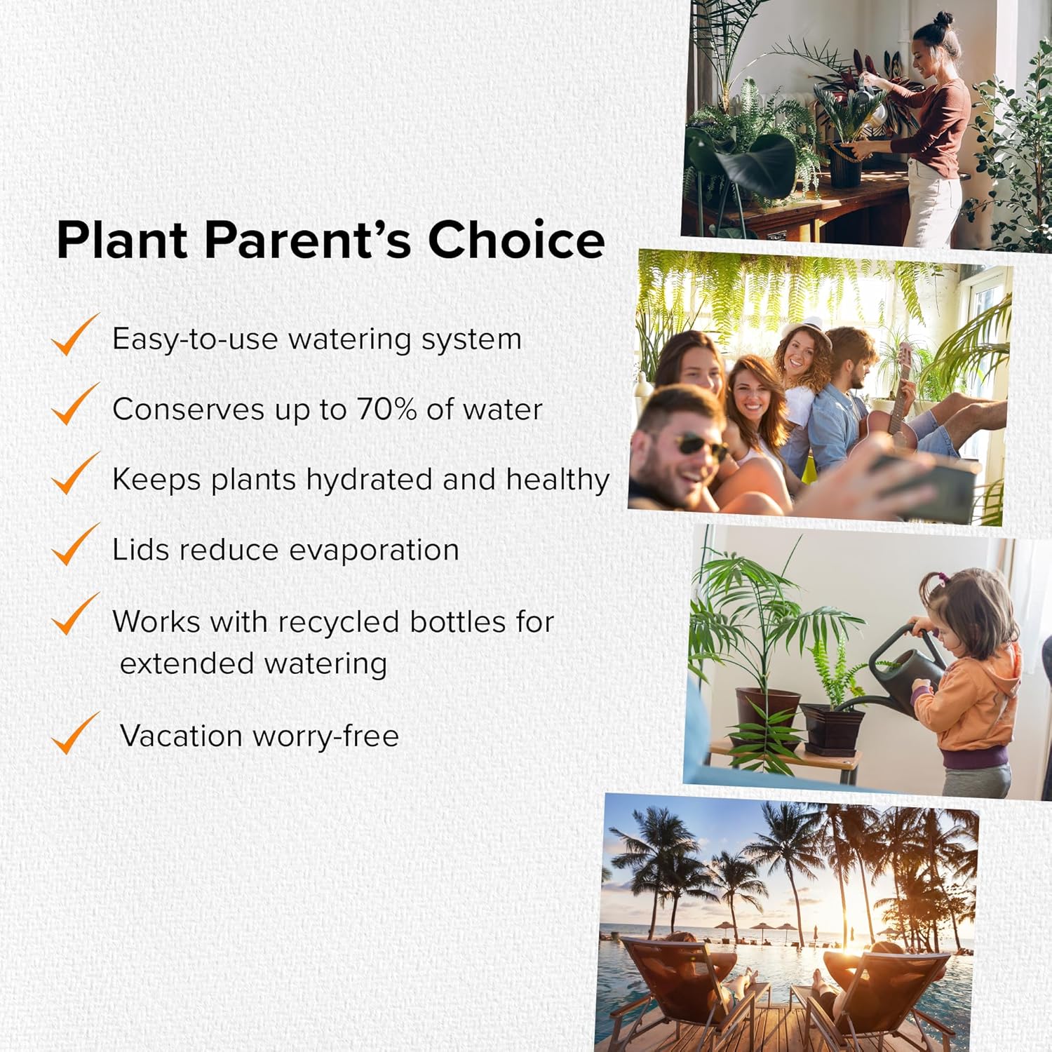 • Vacation-Friendly: Keep your plants thriving and water plants while away. Simply fill the plant stake with water, secure the lid, and let it do its job. For extended trips, you can replace the lid with an inverted bottle full of water. Any small bottle with a neck that fits the spike will work perfectly, providing a continuous water source while away.