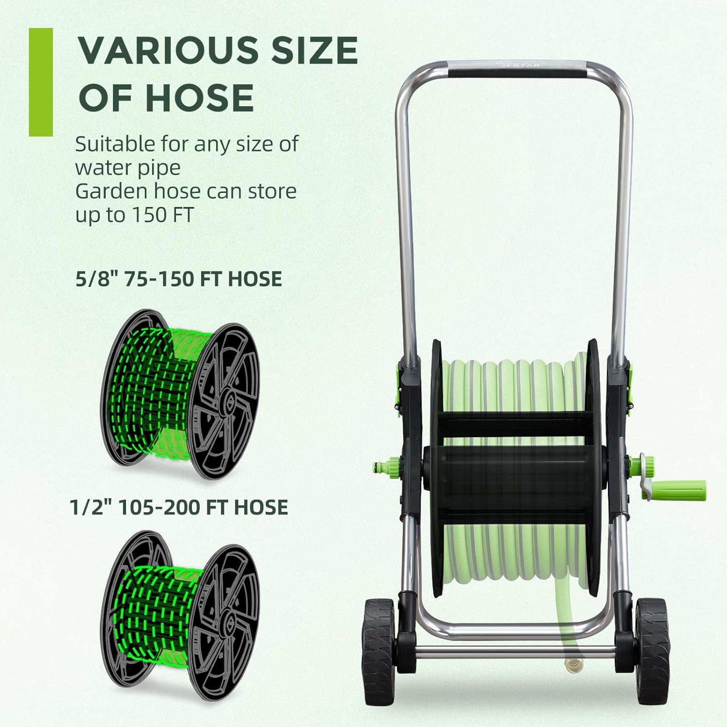 • LARGE CAPACITY: ☘️ This hose cart can hold up to 75-150ft feet of 5/8" hose; The hose cart also comes with a non-slip handle, which allows you to easily roll up the hose so that the hose is not kinked and stored neatly.