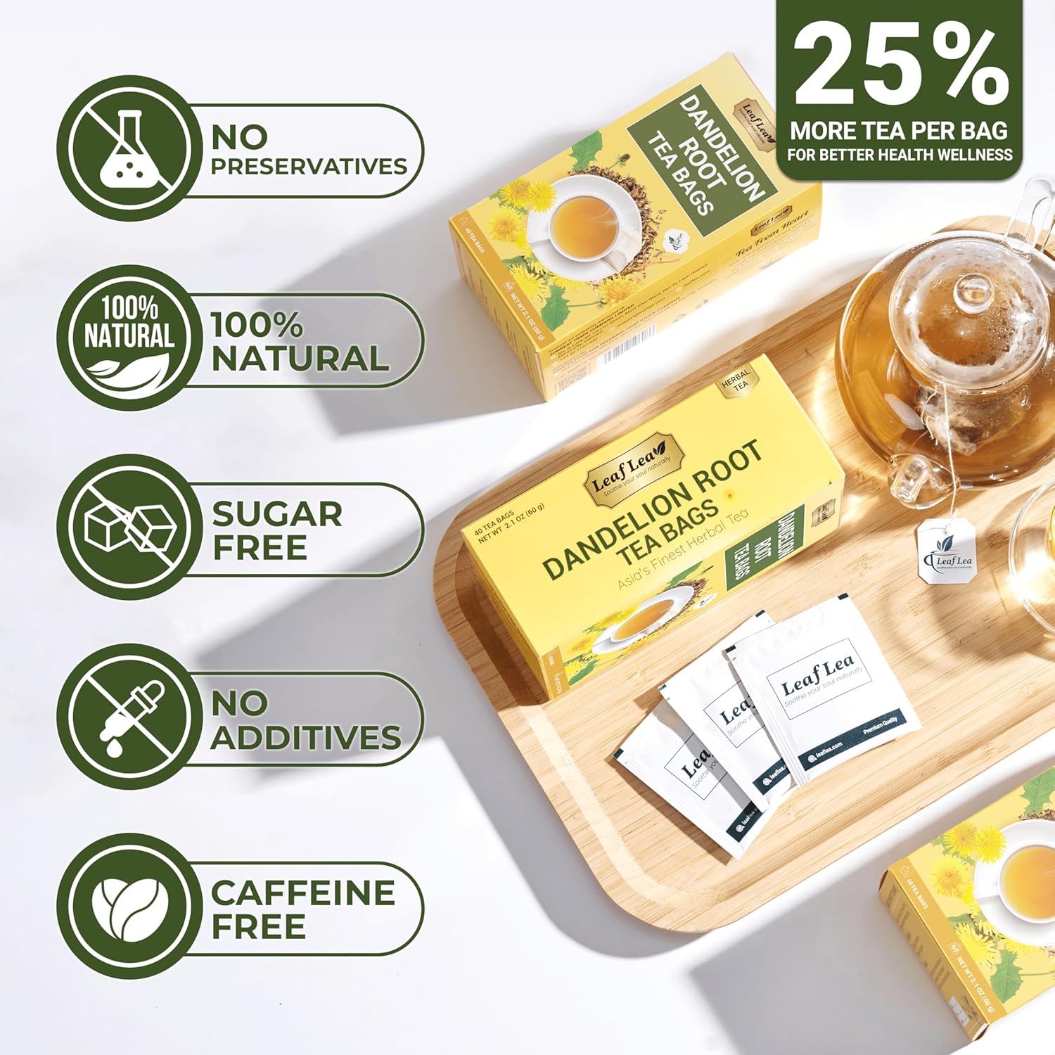 • PREMIUM DANDELION ROOT: LeafLea takes pride in using only the highest quality dandelion root for our dandelion root tea bags. Grown naturally without pesticides or chemicals, this pure, nutrient-rich ingredient ensures every cup is both healthy and environmentally friendly. With dandelion root tea bags, you’re choosing a product that prioritizes your wellness and the planet.