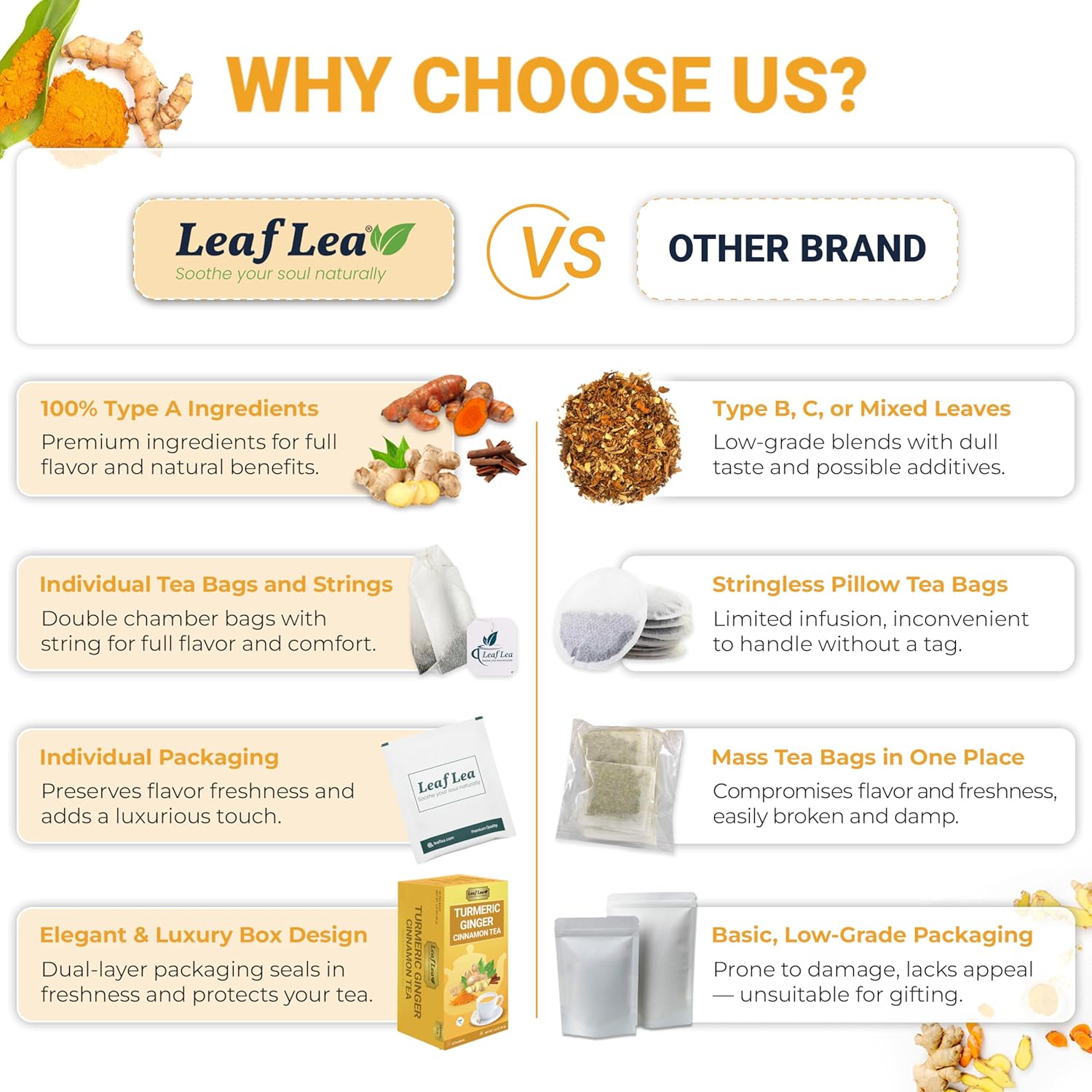 LeafLea Turmeric Tea with Ginger and Cinnamon, 80 Premium Turmeric Ginger Tea Bags, Supports Immune Health & Digestion, 100% Natural & Pure Blend Herbal Tea, Caffeine-Free, No Sugar, Vegan