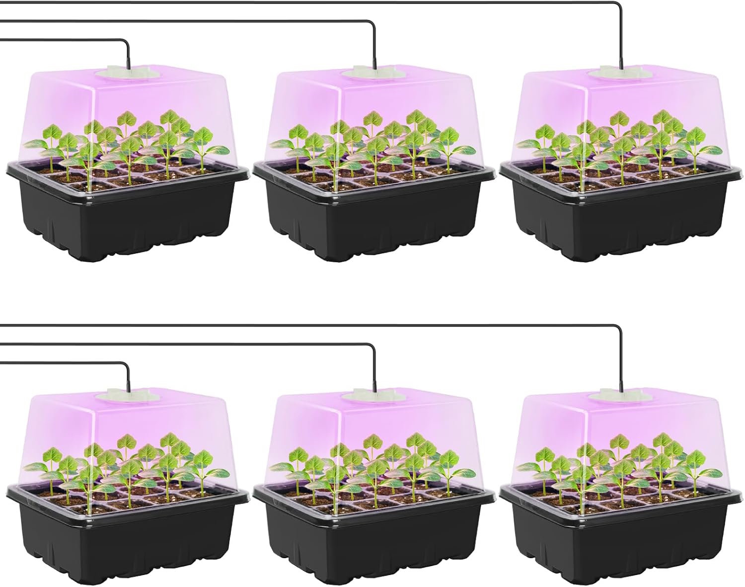 MIXC Seed Starter Kit with Grow Light, Elevated Seedling Tray Kit with Adjustable Humidity Dome and Clear Cell Tray, 12 Full Spectrum Led Beads for Seed Starting Greenhouse, 6 Pack, Black