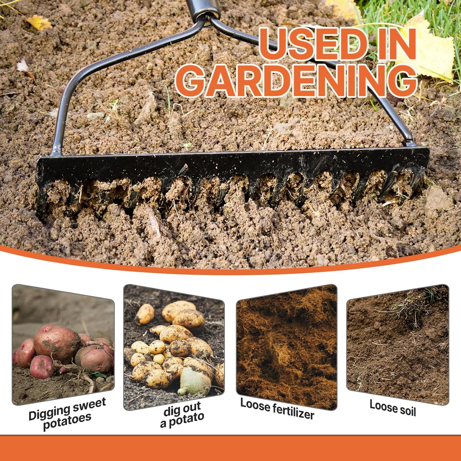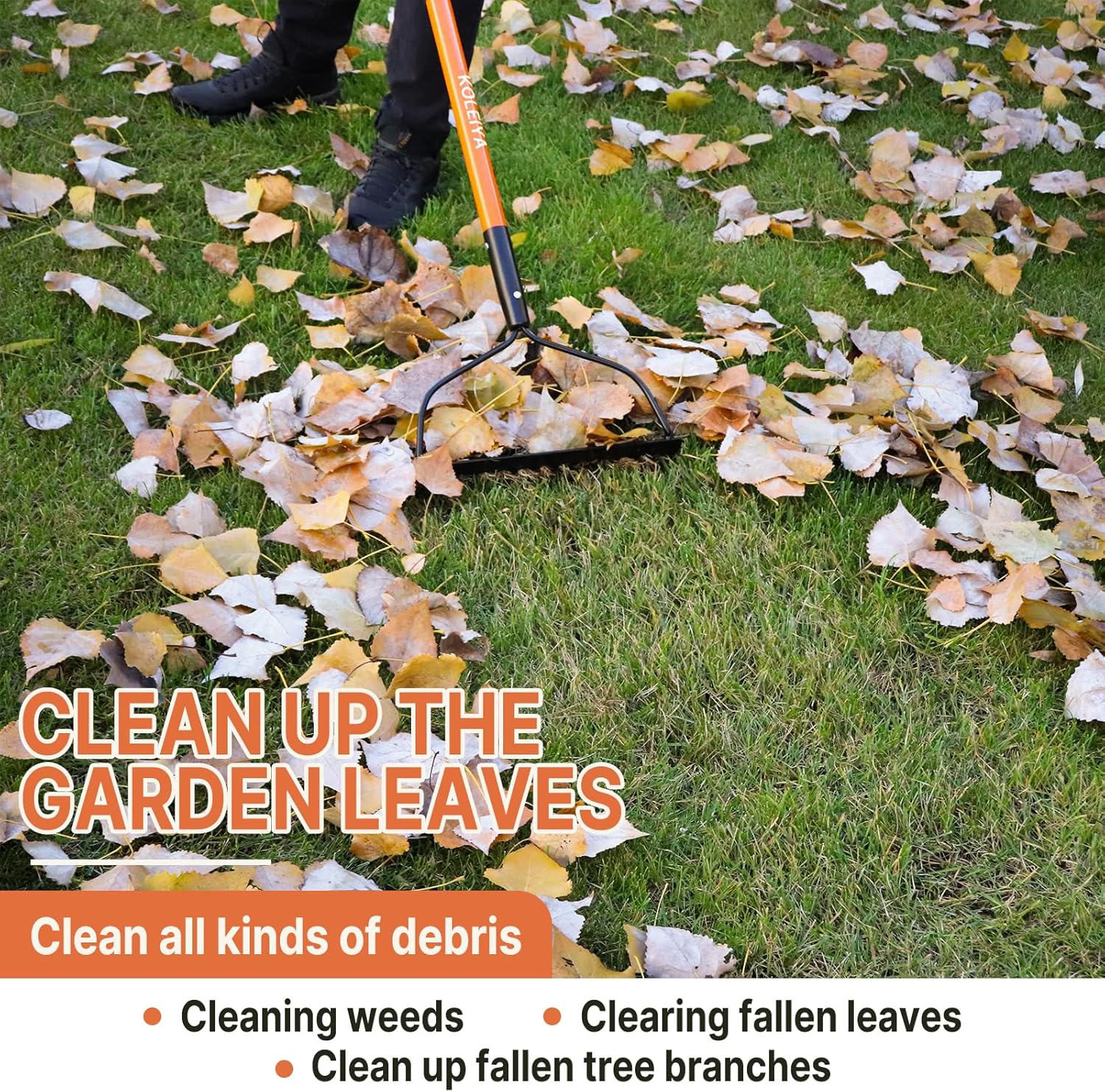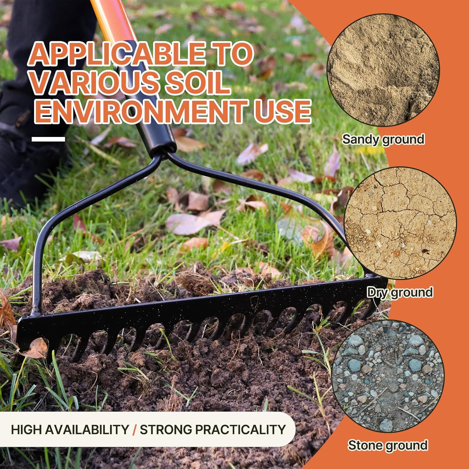 • Multi purpose:garden rake good for leveling/packing soil and raking leaves especially in between plants.Equally suitable for distributed newly laid topsoil,moving soil or mulch.