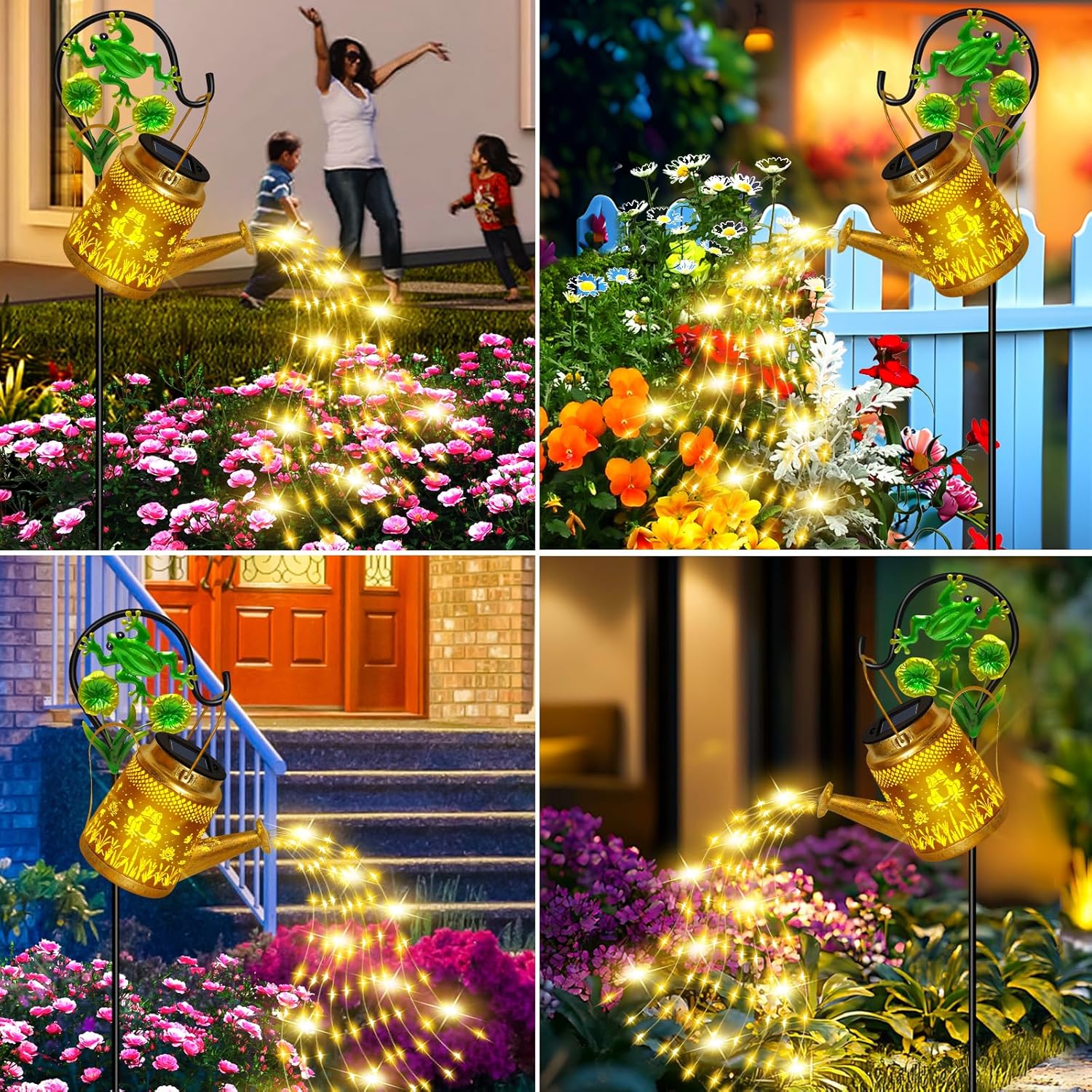 • 【Frog Watering Can & Shepherd Hook】This Frog-inspired watering can light is equipped with 80 bright LED lights, distributed across ten 31.1-inch strands to create a mesmerizing cascading glow, hollow-out design casts Frog patterns onto your garden,. Paired with a sturdy shepherd hook, it is easy to install while ensuring stability in the ground