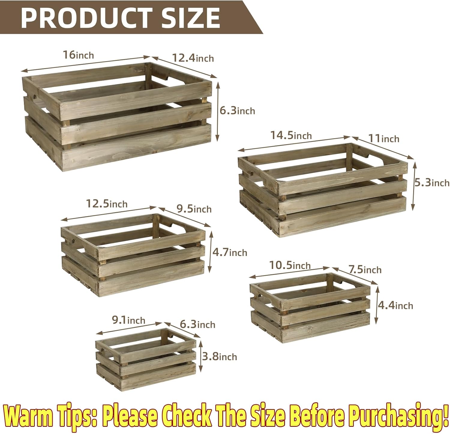 • 5 Sizes Wooden Crates: These versatile nesting wood crates come in 5 different sizes, namely about 16''X12.4''X6.3''; 14.5''X11''X5.3''; 12.5''X9.5''X4.7''; 10.5''X7.5''X4.4''; 9.1''X6.3''X3.8''. Five varied sizes offer multiple choices for holding different types of items