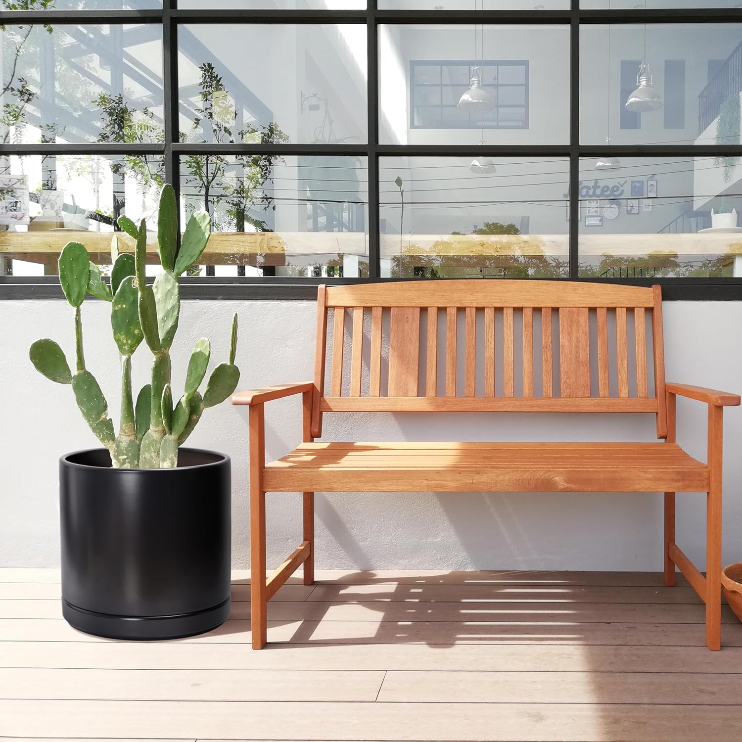 D'vine Dev 14 Inch Ceramic Planter Pot with Drainage Hole and Saucer, Indoor Cylinder Round Planter Pot, Black, 94-O-G-2
