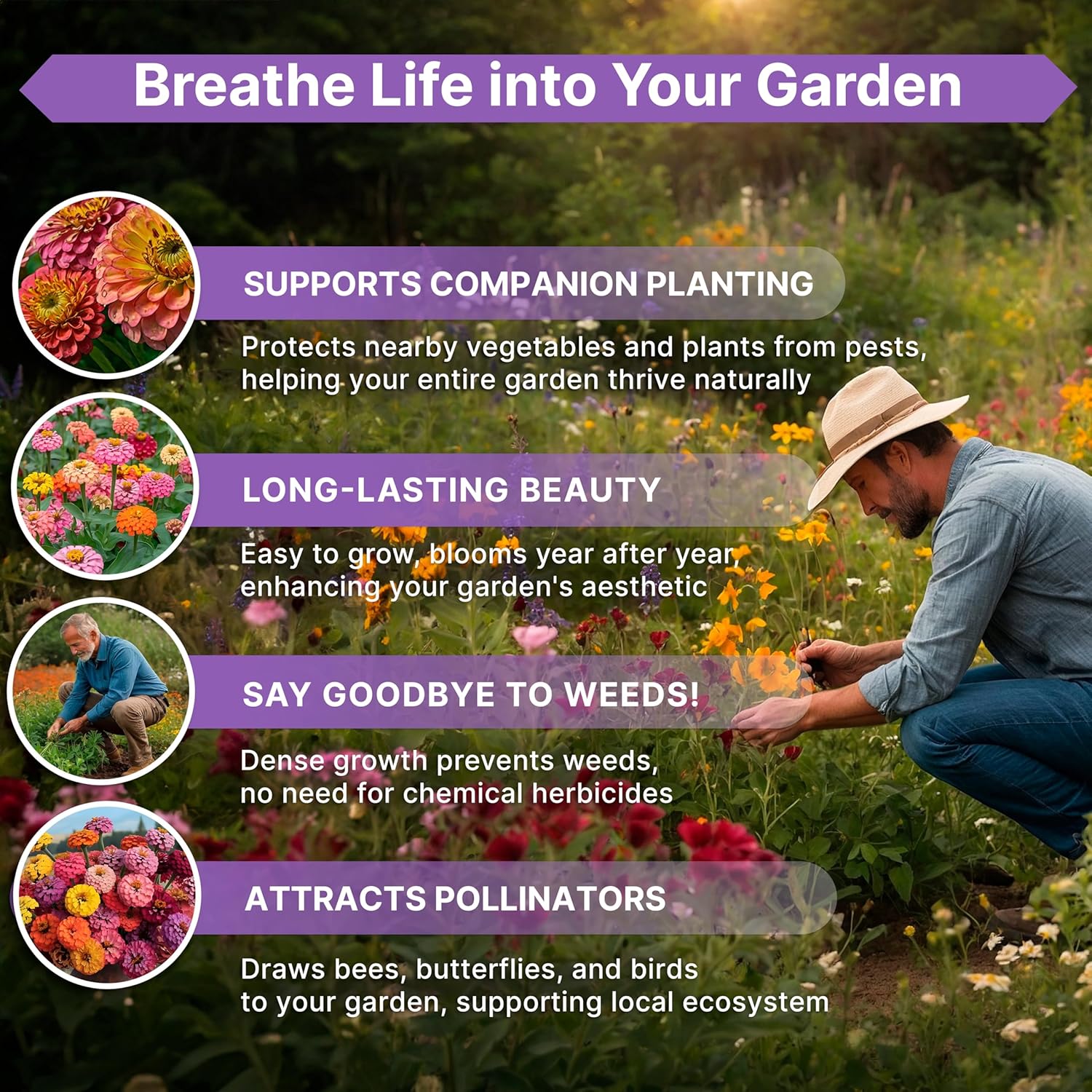 • High Germination Rate - Grow beautiful zinnia flowers effortlessly, whether in indoor trays or your backyard garden. Our premium seeds boast a superior germination rate, rigorously tested to ensure successful growth year-round. Perfect for creating vibrant blooms in your own garden, these top-quality seeds are also a thoughtful gift for gardening enthusiasts.