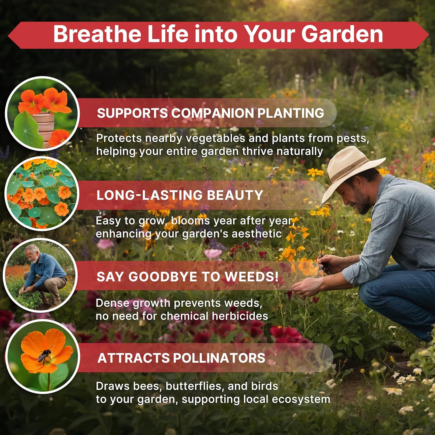 • High Germination Rate - Grow beautiful nasturtium flowers effortlessly, whether in indoor trays or your backyard garden. Our premium seeds boast a superior germination rate, rigorously tested to ensure successful growth year-round. Perfect for creating vibrant blooms in your own garden, these top-quality seeds are also a thoughtful gift for gardening enthusiasts.