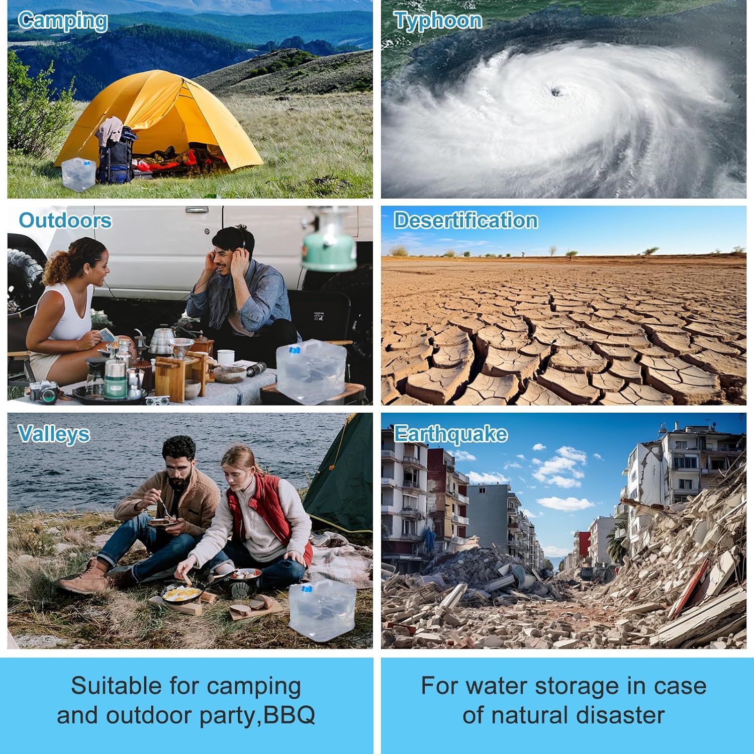 • Use in Emergency Scenarios:Our collapsible water container is ideal for emergency water storage during disasters like tornadoes, fires, tsunamis, or droughts. It’s also great for wild camping, vacat 4 gallons of water or just need a smaller option, these collapsible containers can handle a variety of scenarios where safe, reliable water storage is critical