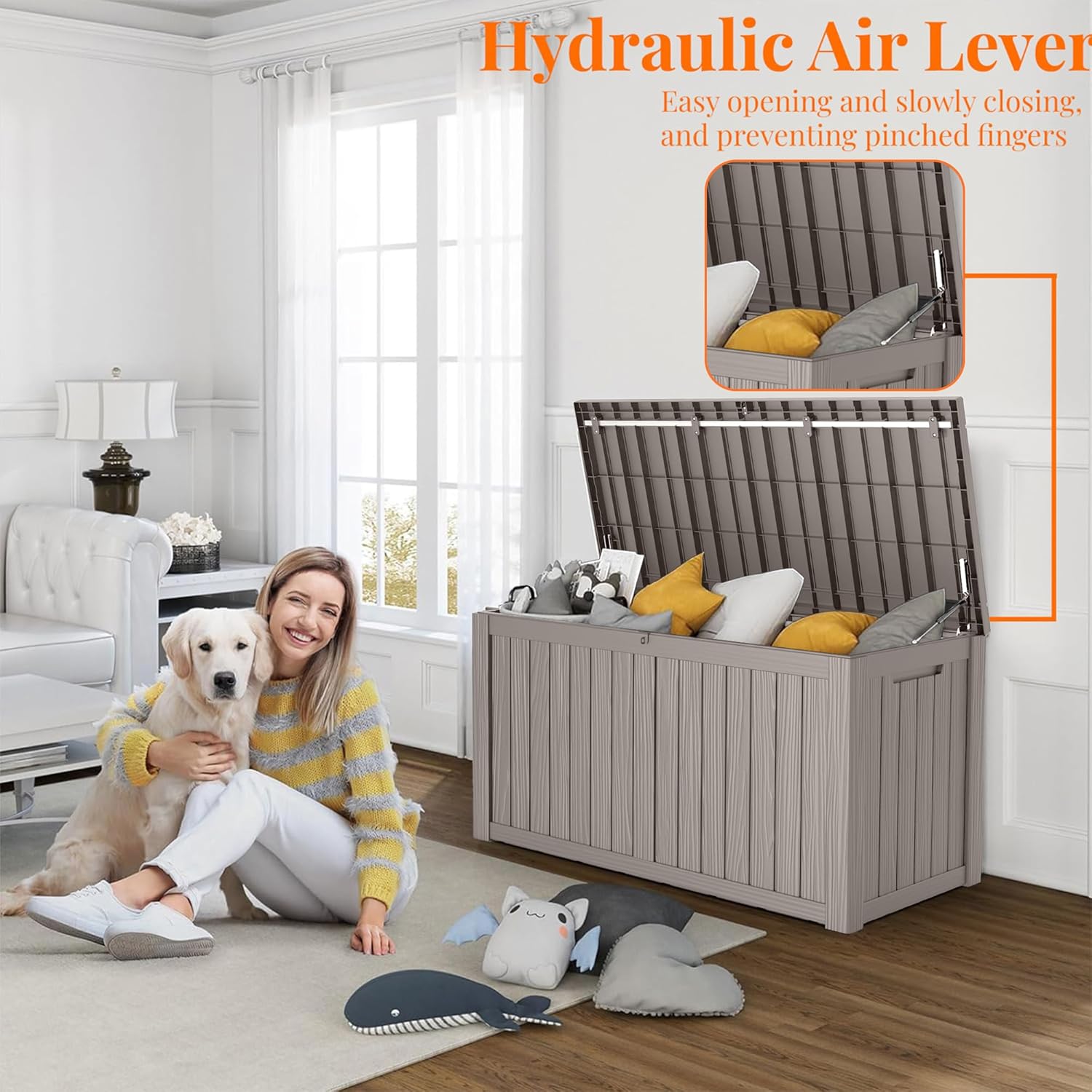 • ADAPTABLE TO VARIOUS SCENES: Whether used as an indoor laundry storage chest or an outdoor deck box container for items like outdoor cushions, garden tools, pool accessories, and sports equipment, this patio storage box provides abundant space. It's also versatile as a side table, yard seat, storage bench, or footrest