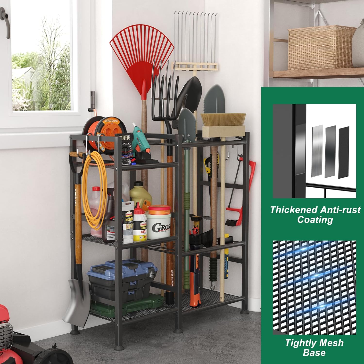 • 【Up to 35 Long-Handled Tools】The three-tier design of the tool rack has 35 slots of different sizes for long-handled tools; it also comes with 5 large removable hooks. The tool rack is equipped with 4 leveling feet for use on uneven surfaces.