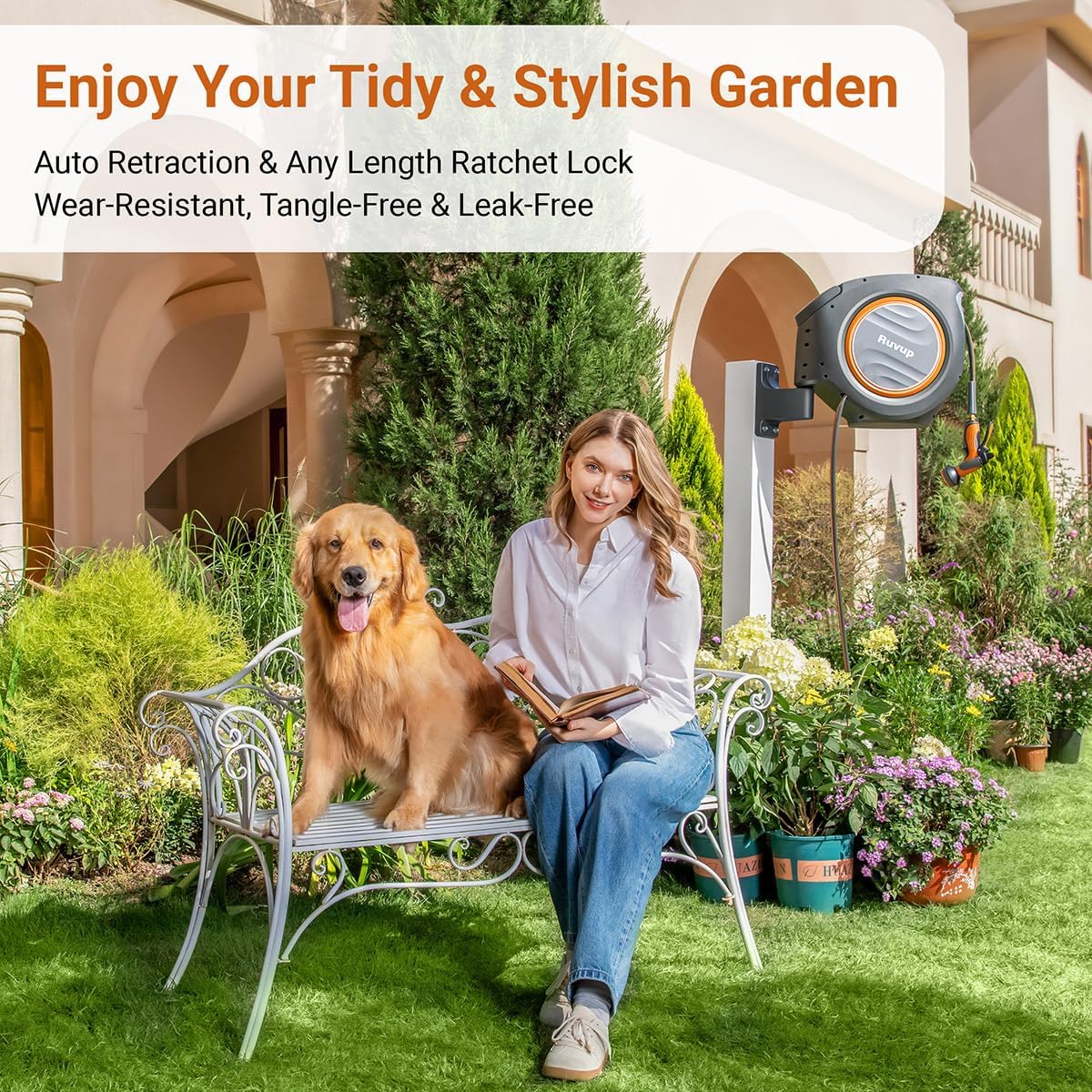 • Convenient, Tidy and Stylish: Featuring a patented ratchet locking system and unique automatic hose retractable technology, the Ruvup garden hose winding reel smoothly retract the hose back into the casing, no jamming or overlaps. Make your gardening tasks easier with the Ruvup wall mount hose reel and enjoy your tidy and stylish yard.