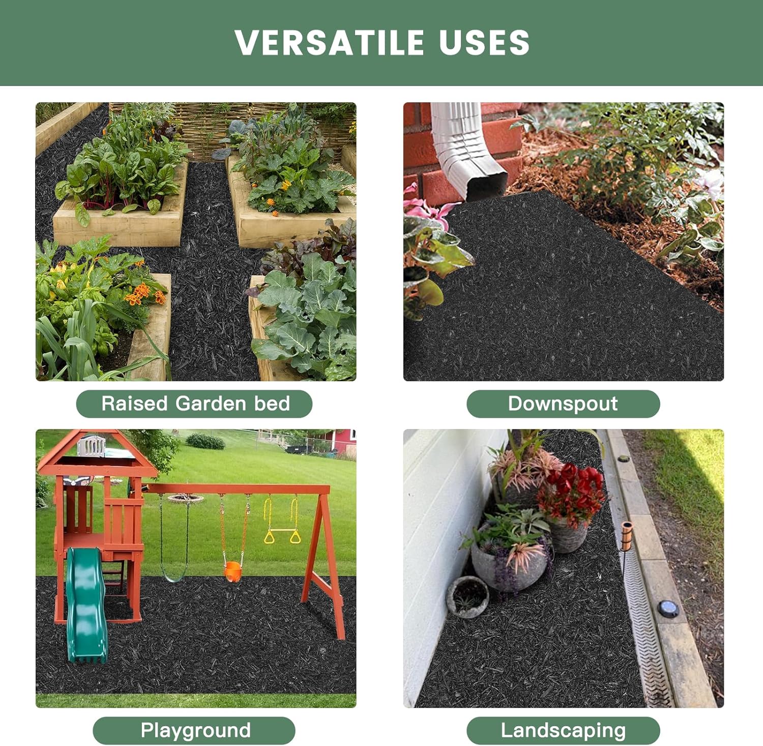 • VERSATILE: Gentle on feet and knees, not only can it be used as a pathway, weed barrier and to cover muddy areas, rubber mulch also can be placed between raised garden beds, in drainage areas, in outdoor play areas, around pools, on slippery slopes and more.