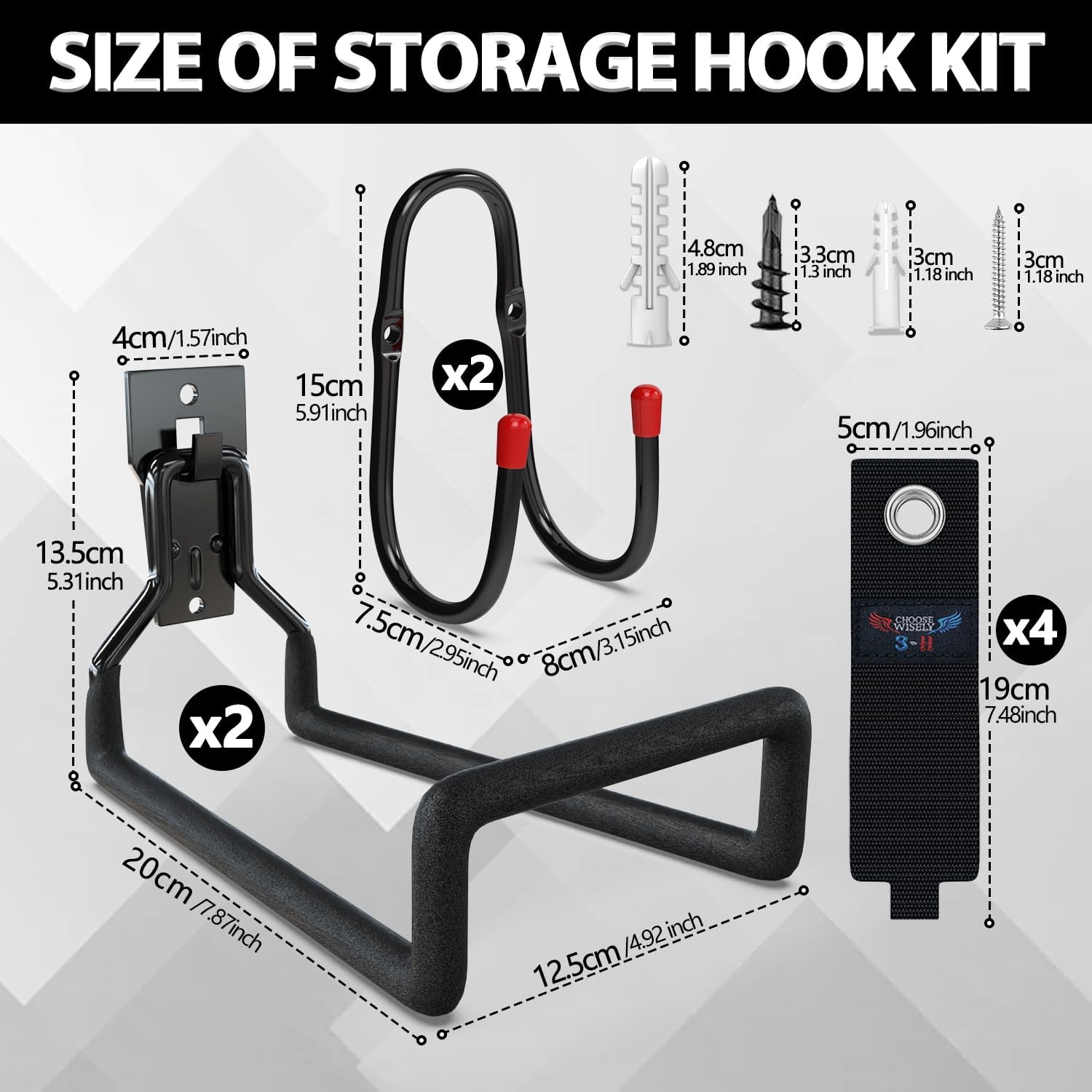 3-H Solid Steel Garden Hose Holder - 4 Pack Wall Mount Hanger with Extension Strap for Outdoor Air Hose, Ropes, Pipes & More