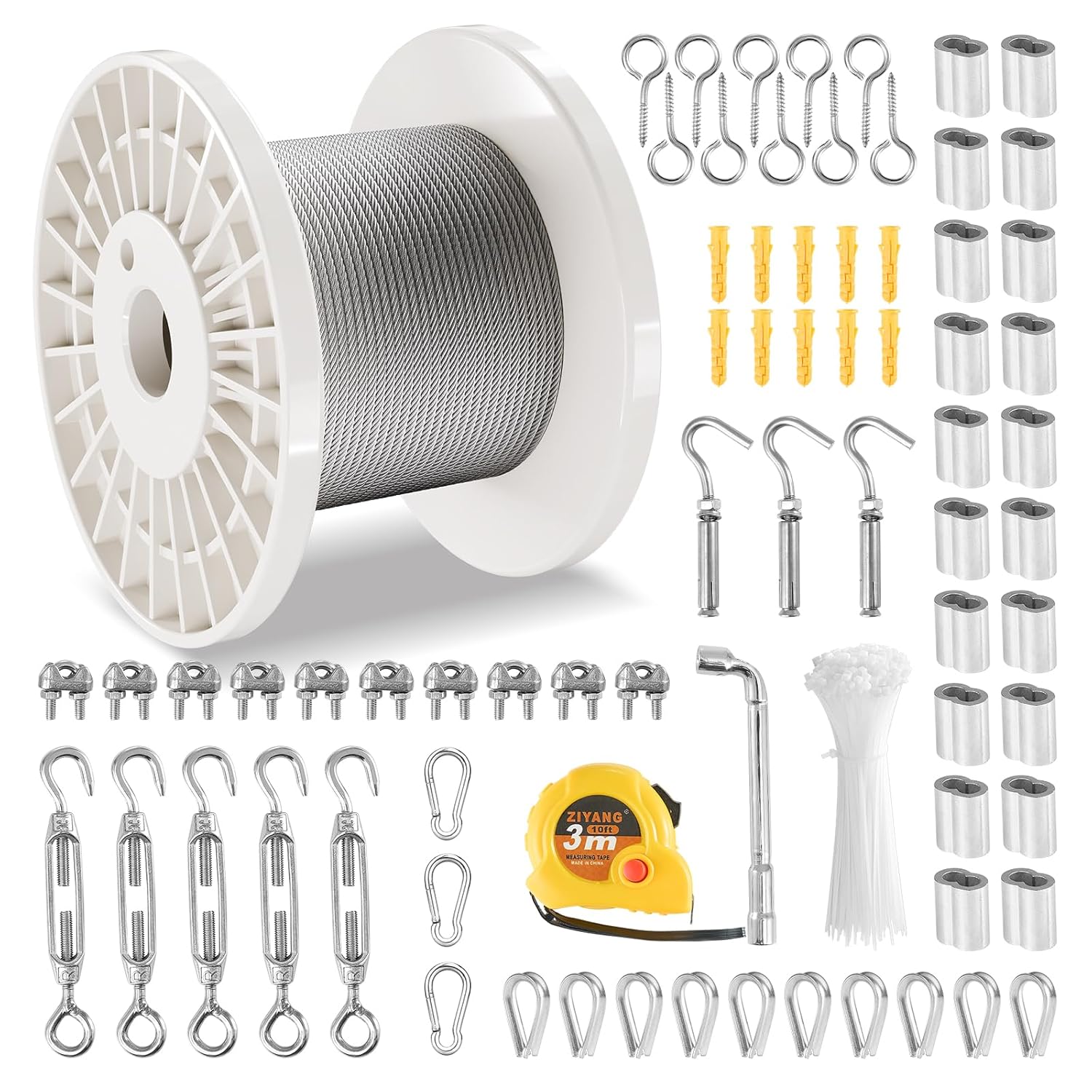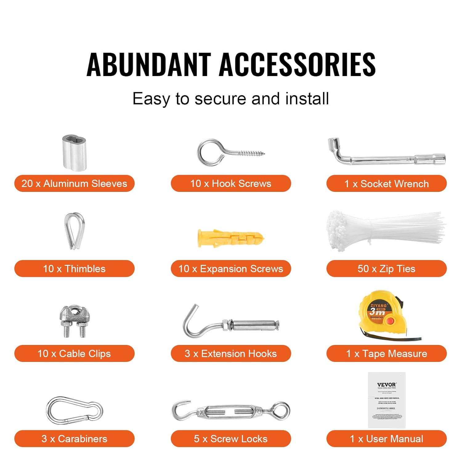 • Easy to Install and Use: VEVOR aircraft cable comes with 20 x aluminum sleeves, 10 x thimbles, 10 x hook screws, 3 x carabiners, 3 x extension hooks, 5 x screw locks, 10 x cable clips, 1 x socket wrench, 1 x tape measure, 10 x expansion screws, 50 x zip ties, and 1 x user manual – everything you need for a breeze of an installation.