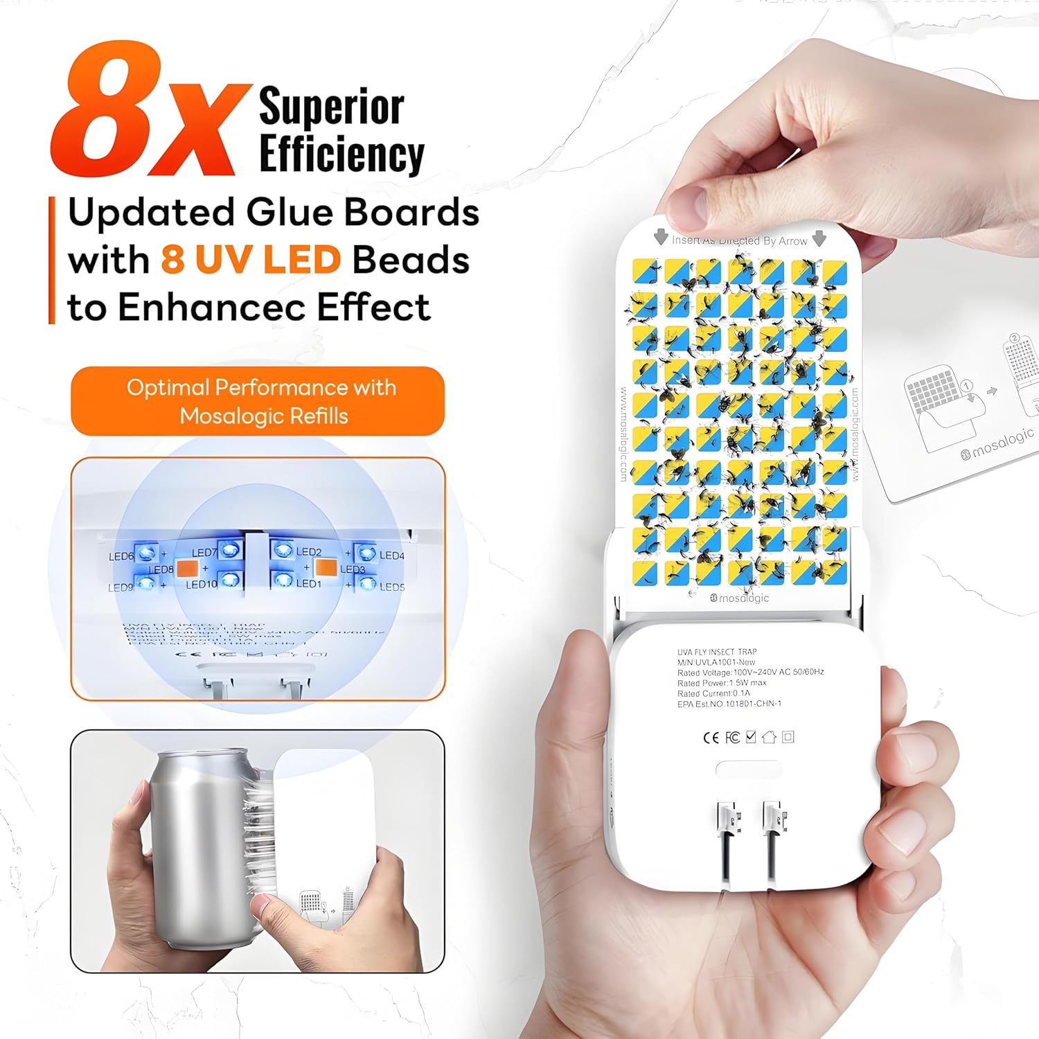 • Powerful UVA Fly Trap: Experience 8x the effectiveness with our mosquito killer that applied 8pcs upgraded UV LED beads to lure a variety of flying pests including fruit flies, gnats, moths, mosquito and more. The enhanced adhesive board ensures they're caught and stay caught for unmatched pest control.