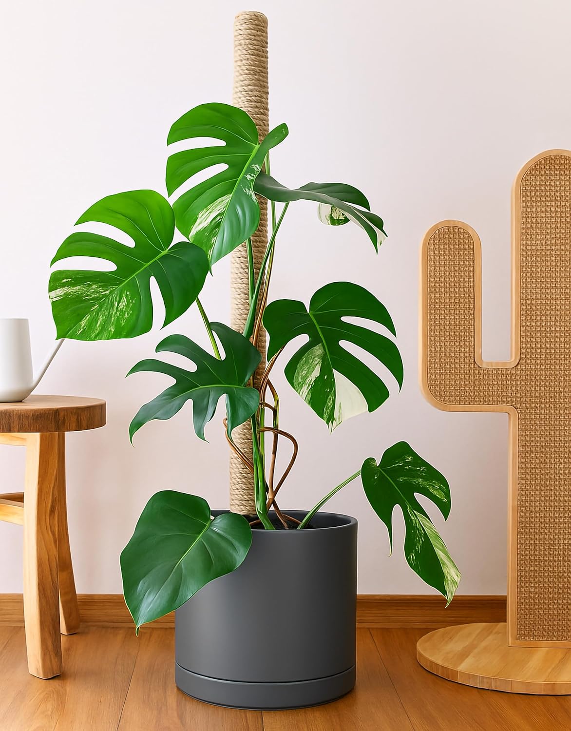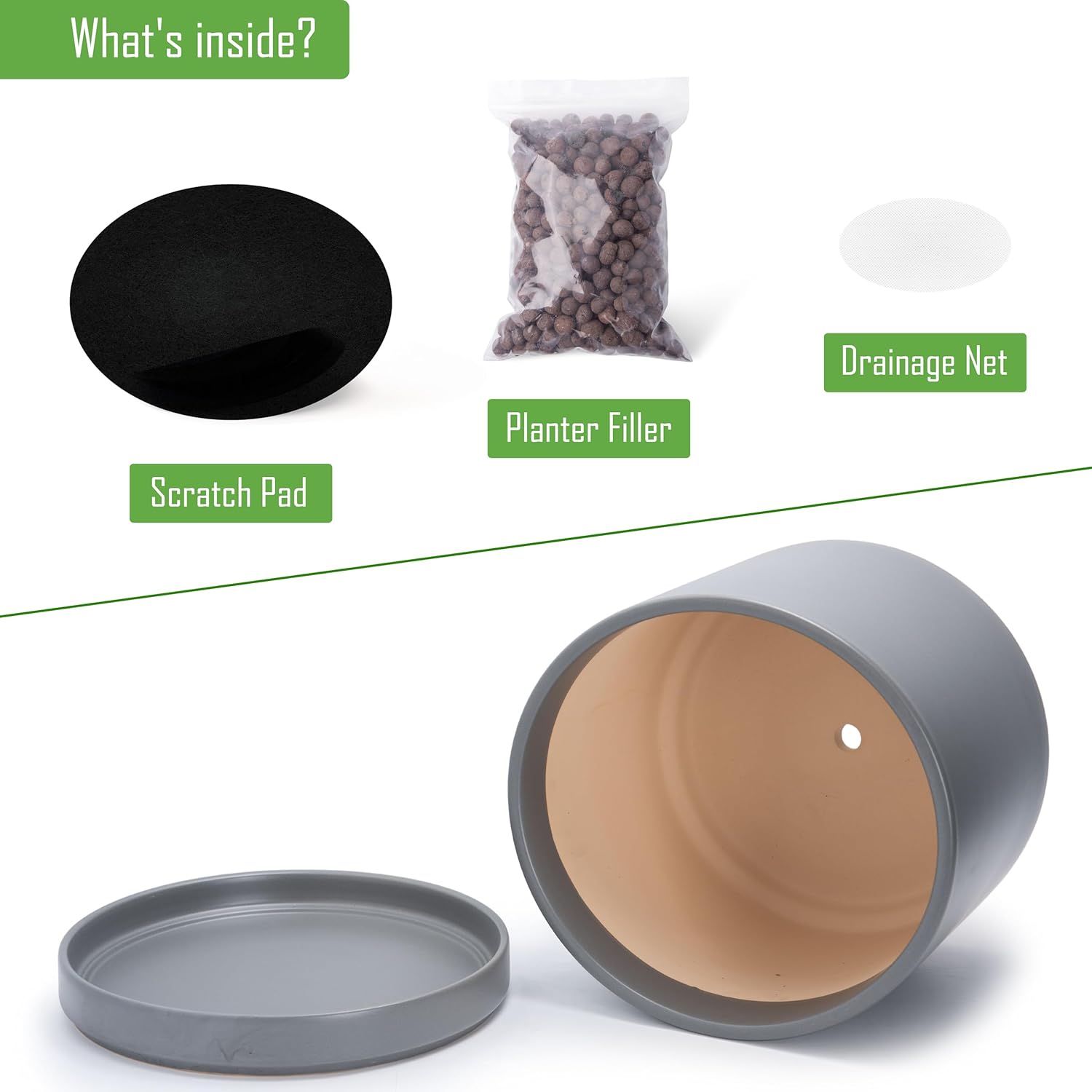 • Planter pot with drainage hole, mesh drainage net and protective scratch pad included.