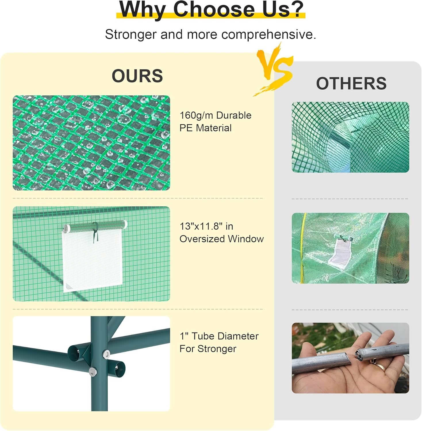• 【Heavy Duty Galvanized Frame】We have upgraded the load-bearing bar of the warming house, using high quality galvanized material to increase a certain amount of load-bearing; the horizontal bar and 4 diagonal bars greatly improve the stability of the tunnel green house.