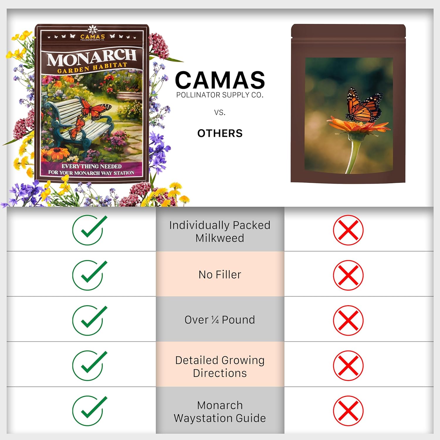 • At Camas Pollinator Supply, our milkweed seeds are carefully separated for unique growing needs, including cold stratification, ensuring better success in your butterfly garden. Our seed packets also include a FREE e-book that teaches you how to grow milkweed from flower seeds to plant outside and register a certified Monarch Waystation. Perfect gift for the gardeners in your life, wildflower lovers and anyone looking to enhance their garden with high-quality garden seeds.