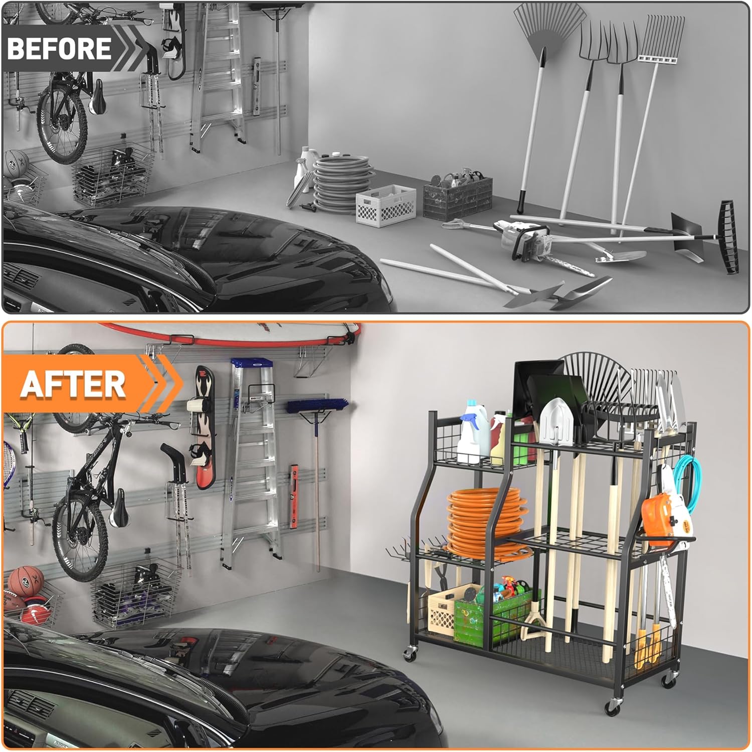 • Maximize Storage with Larger Capacity: With three tiers, this tools organizer holds rakes, shovels, brooms, and more. It has slots for long handles, hooks for small tools, shelves for gardening supplies, giving you ample storage