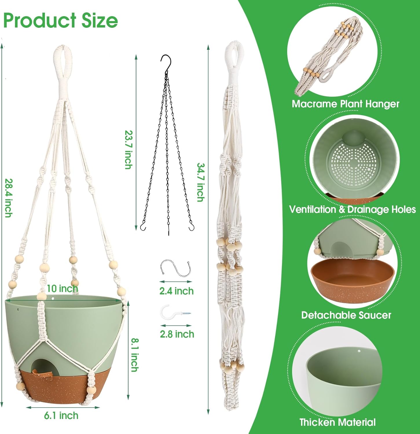 • Self-Watering Hanging Planter: 10 inch Self-Watering Hanging Flower Pots with removable saucer that acts as a reservoir to store a large amount of water for consistent watering, when your plant needs water, the water is diverted from the reservoir to the soil through absorbent cotton ropes, make sure the plant roots reach the bottom and get enough water and nutrients.