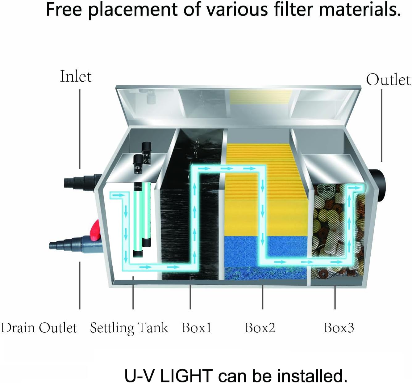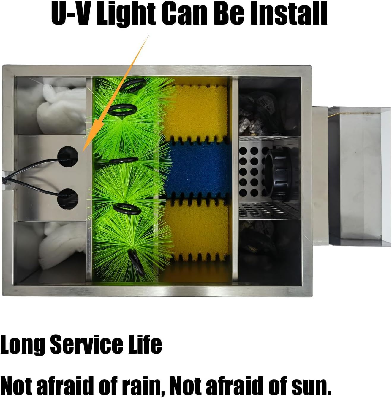 • Stainless Steel Box:long service life. Normal use will not be damaged.Not afraid of sun and rain.Suitable for decorative ponds 500~3000 Gallons.The specific volume of use is determined by the cleanliness of the fish pond water.