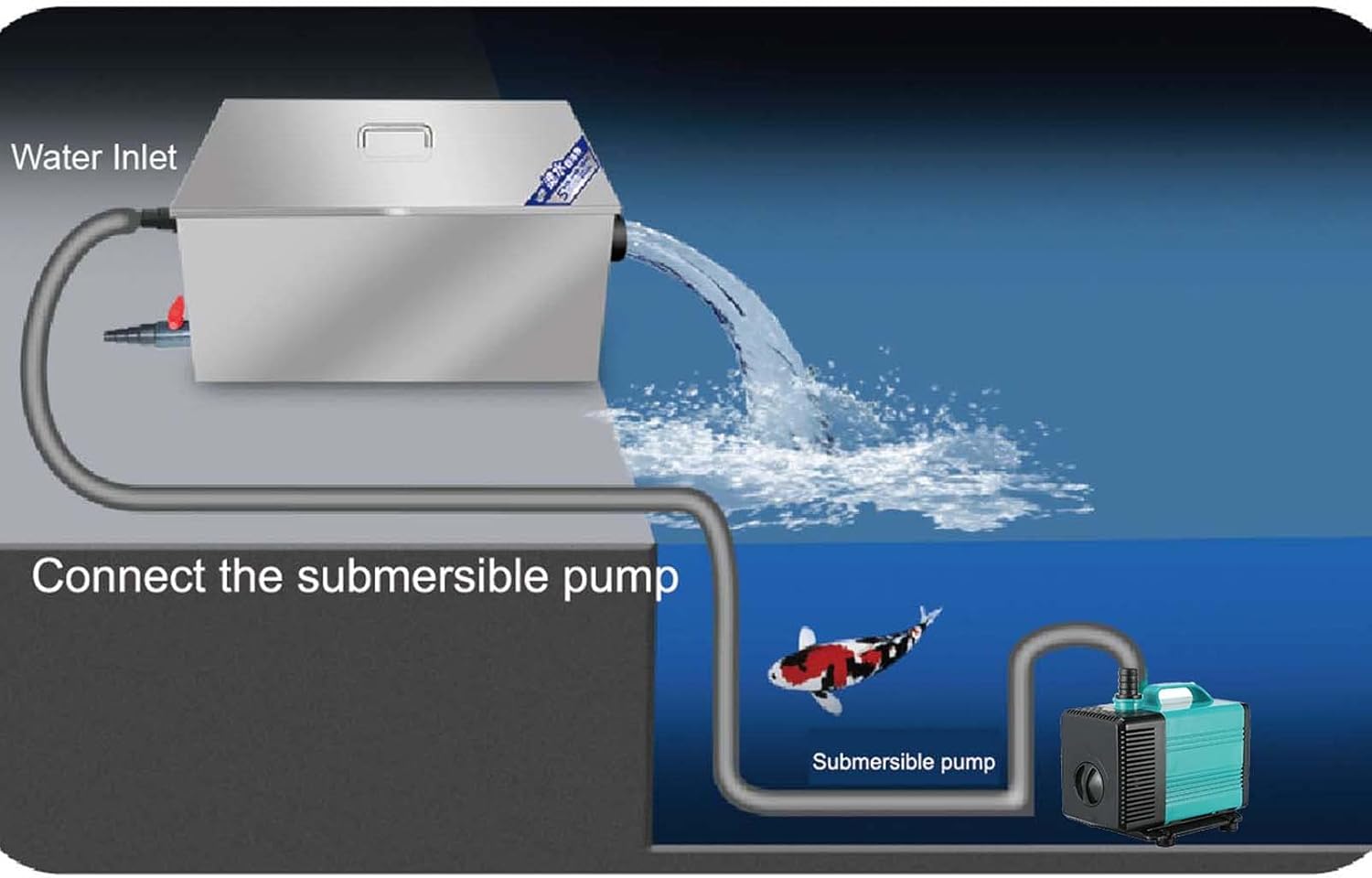 • Waterfall Outlet: let the water flow down like a waterfall, let your fish pond, turtle pond become more beautiful.