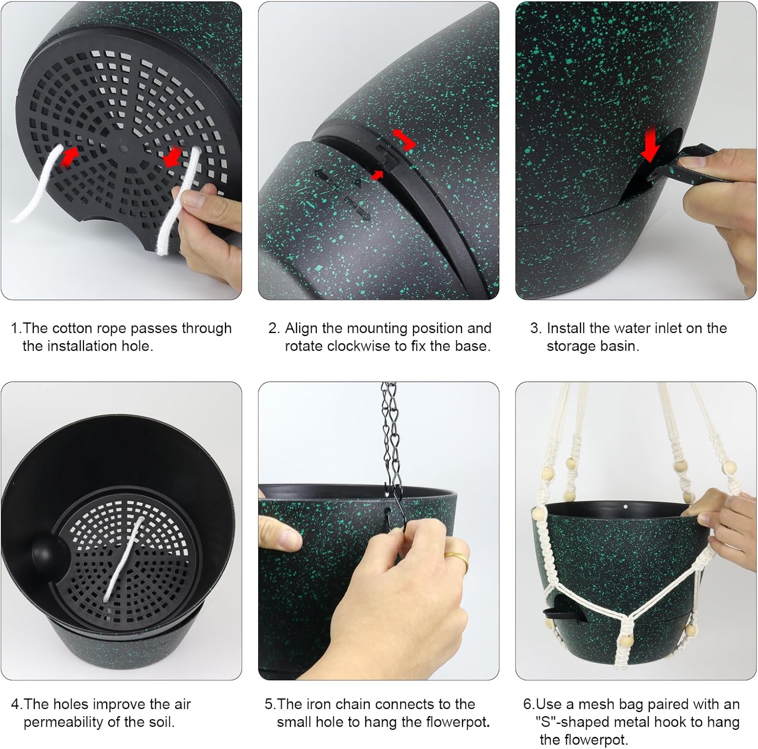 • 【Self-Watering Hanging Planter with Removable Tray】This hanging flower pot comes with a detachable bottom tray that acts as a water reservoir, holding a good amount of water. When your plant needs water, it’s absorbed through cotton wicks from the reservoir to the soil, reducing how often you need to water