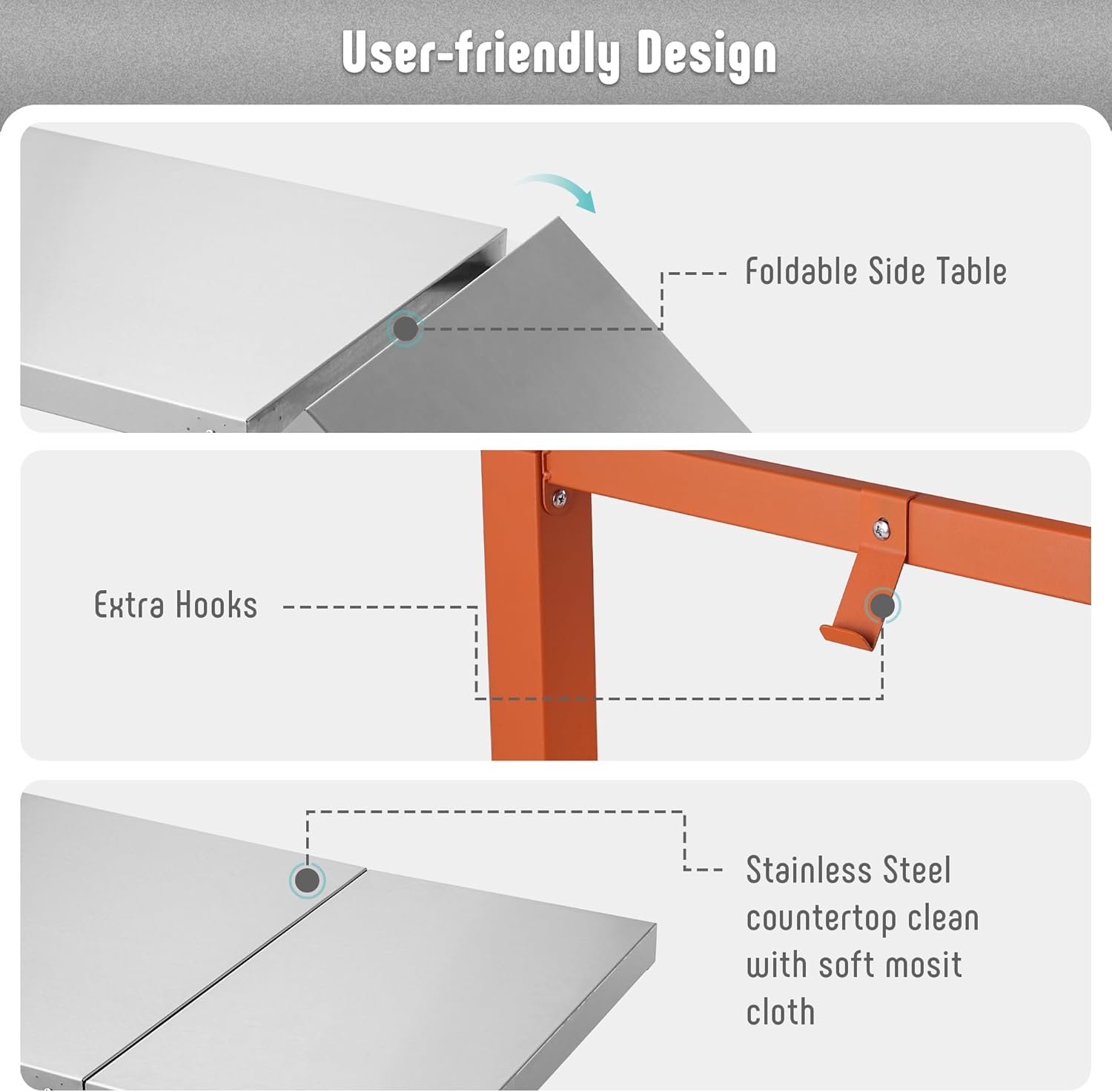 • Smart Storage Solutions: Includes a gas cylinder hanging hook and six utensil hooks to keep your cooking essentials organized. No mess on your outdoor kitchen table anymore. The foldable extension table provides additional work surface when needed