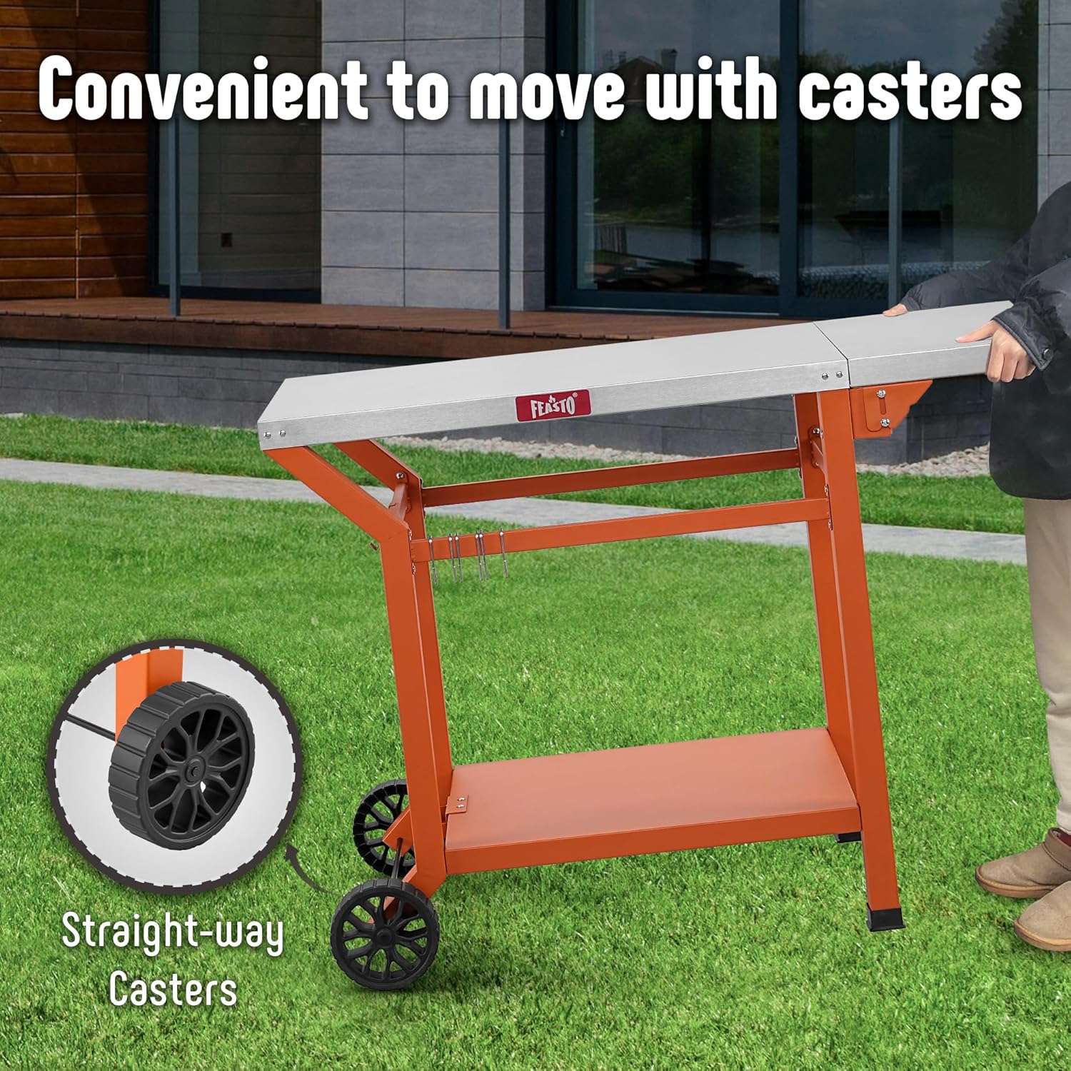 • Convenient Mobility: Equipped with two movable casters and two stationary legs, Feasto grill table cart offers effortless maneuverability and stability, making it easy to reposition during outdoor cooking sessions. No need to struggle to carry heavy tables
