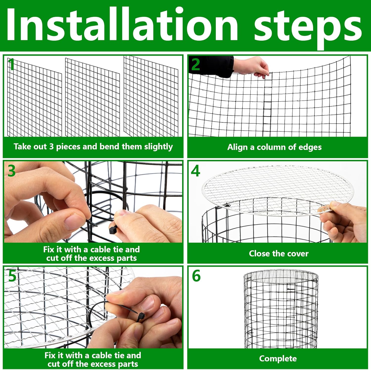 • Easy To Assemble:You don't need extra tools, just enclose 3 pieces of metal mesh and secure them together with nylon hand straps. Then place the assembled wire plant cage around the plants, add a lid and you're done. Secure them in the soil with U-shaped ground plugs to make sure they are secure enough.