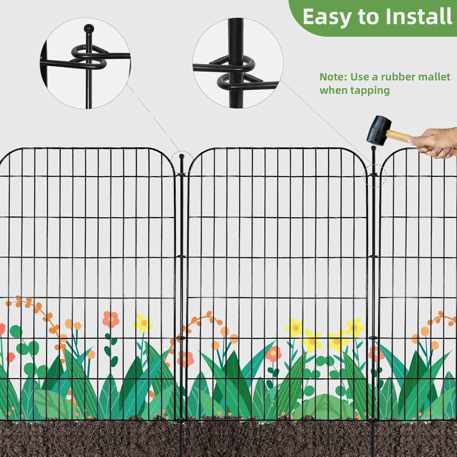 • 【 Easier to Assemble】No need snaps or ties. Simply align the holes in the center of the two fence panels and insert them into the soil with metal stakes. Conical metal stakes at the bottom make installation easier and less labor-intensive. Not easy to damage the fence panels, such as breakage and deformation. Rubber hammer strikes the top of the metal stake. Done!
